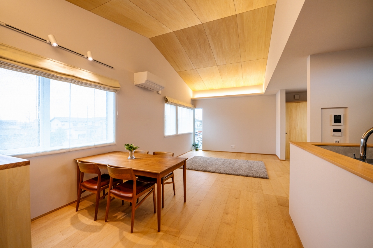 メープルの床材とシナ合板で仕上げた船底天井のLDK。間接照明でやさしい空間に。