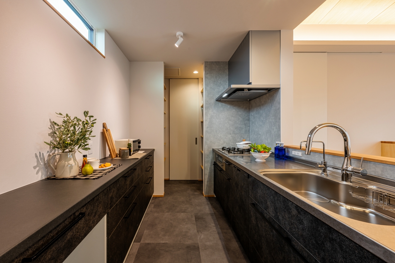黒、グレーでまとめ、スタイリッシュなキッチン空間に。