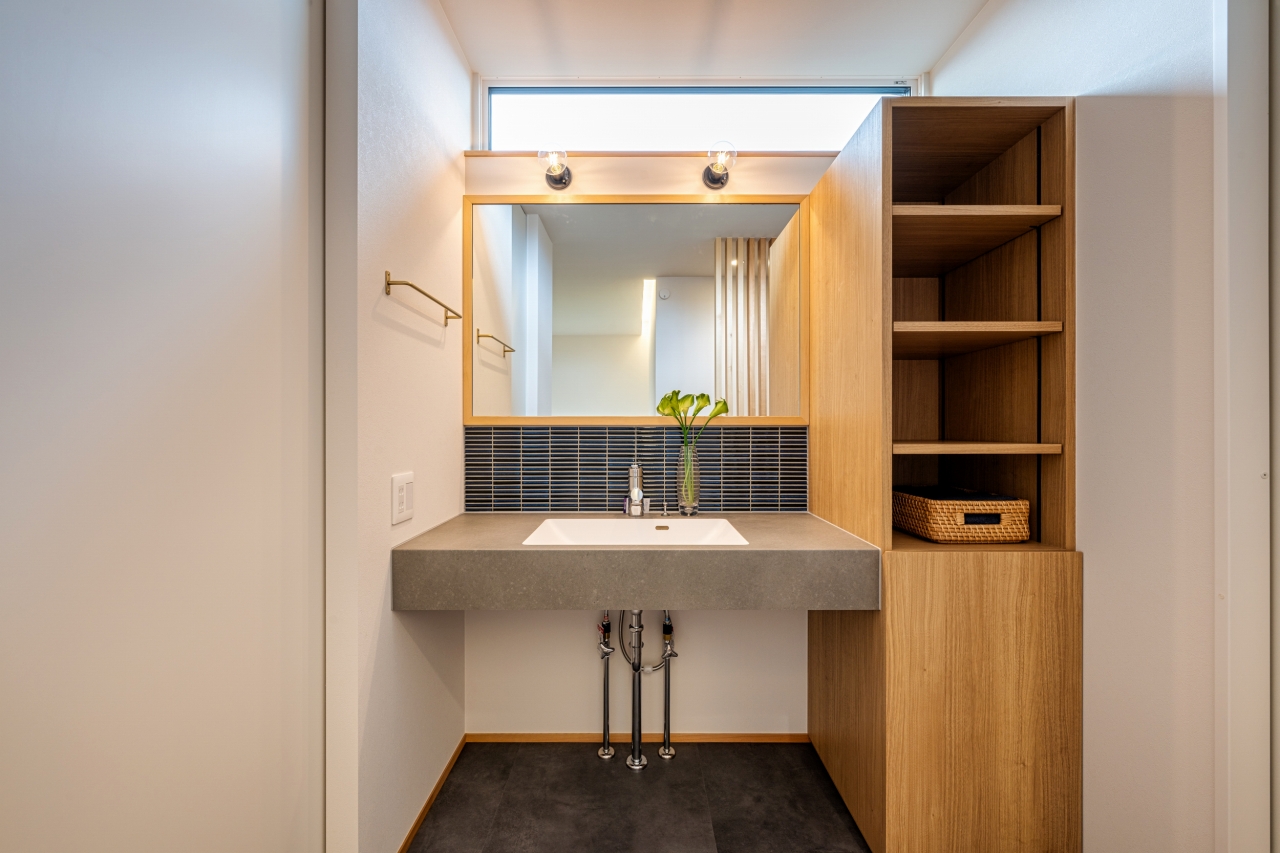 モルタル調の洗面台とタイルで仕上げた造作洗面台。