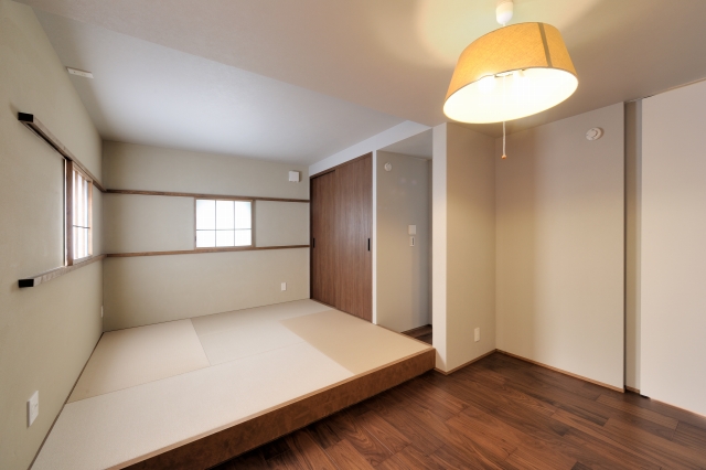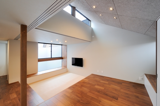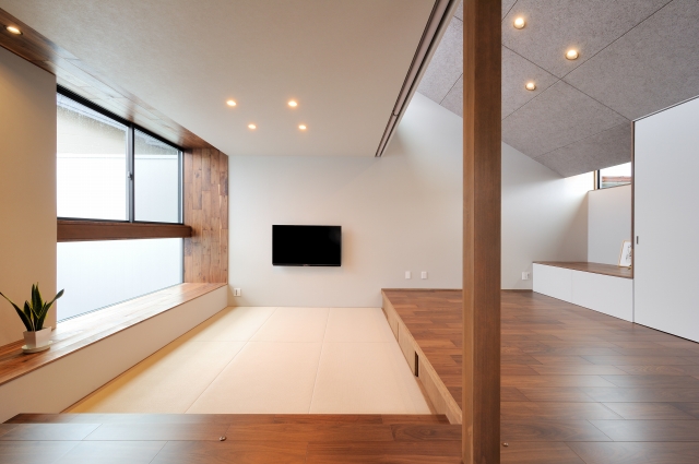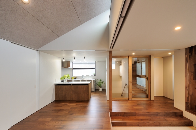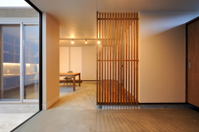 外の土間、内の土間、たたみで段差を緩やかにつなげ、 個々のプライバシーも確保した。