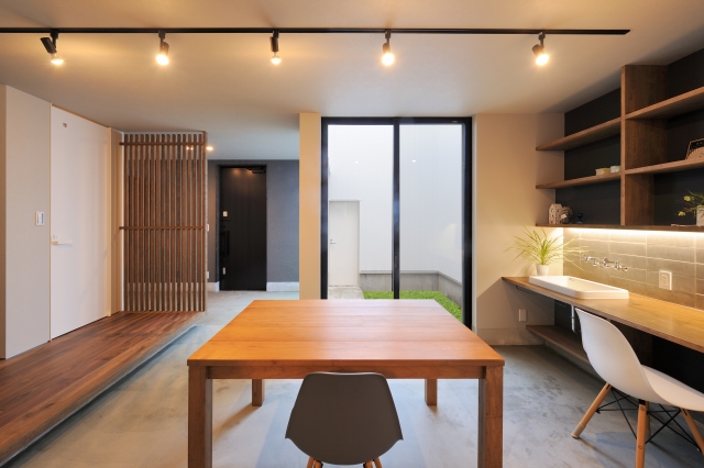 四方が建物に囲まれている旗竿の敷地 町との遮蔽を求めつつ、空間のつながりをとりたい。