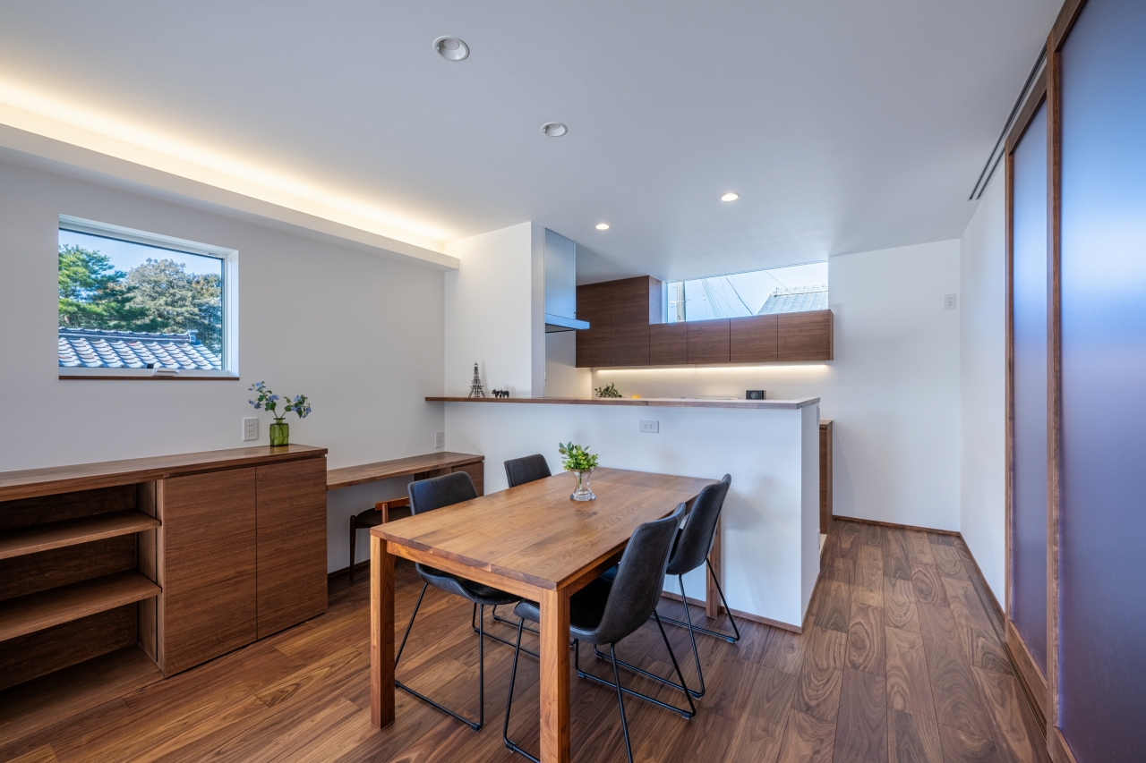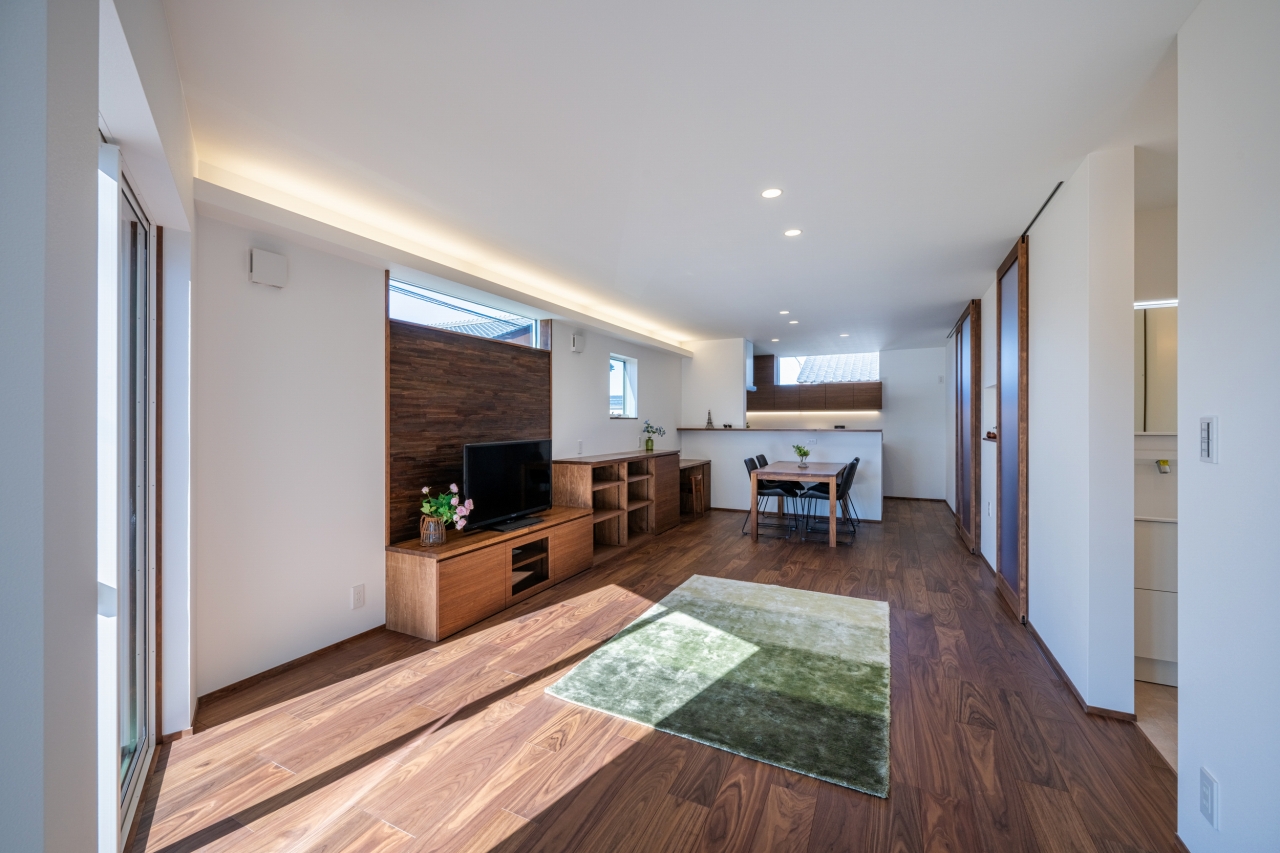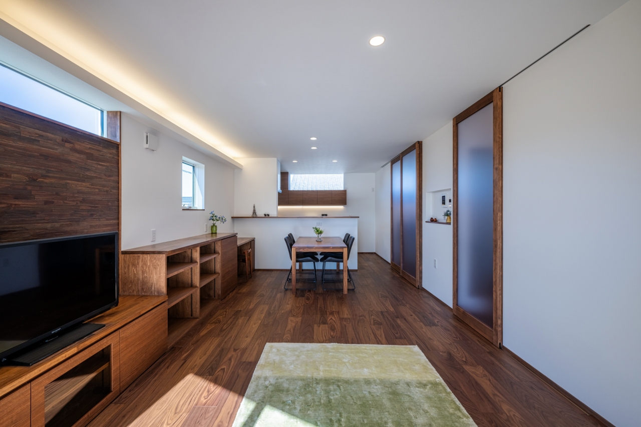 一直線に配置されたLDK。天井を照らす間接照明により空間の広がりを演出。