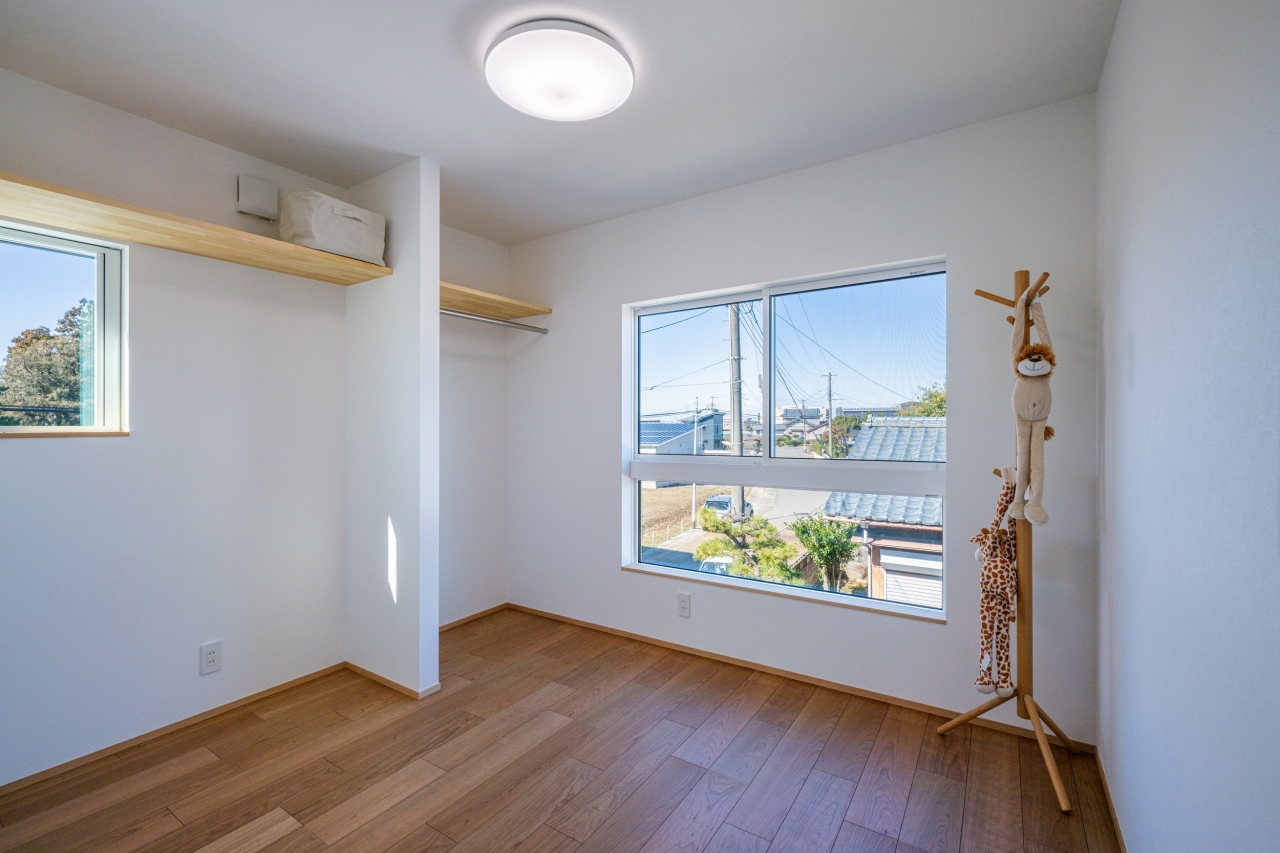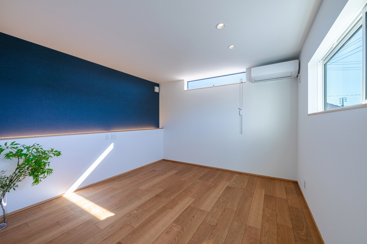 ベビーベッドやデスクも置ける8畳の寝室。ヘッドボードには間接照明を付け、夜でもほんのり明るい。