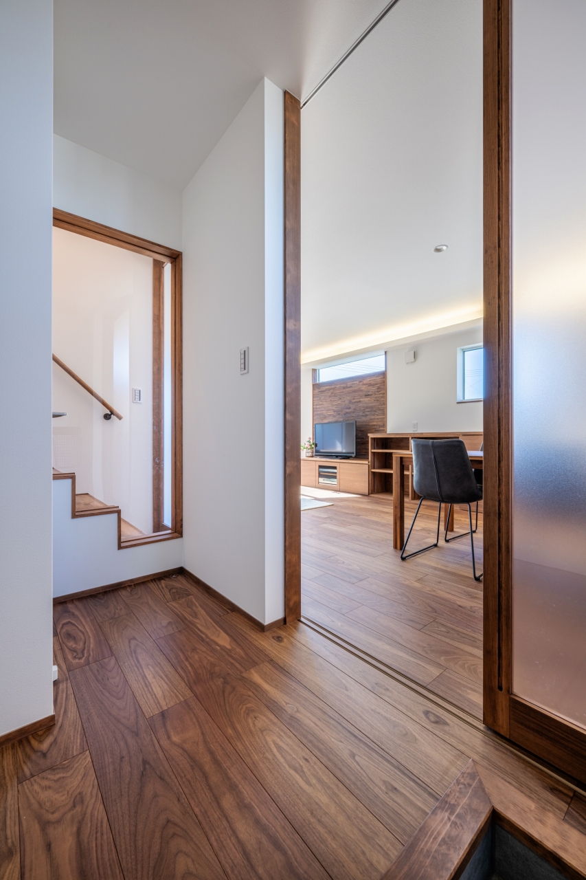 階段の壁に内窓を設けたことで、奥まで視線が抜ける。玄関を広く使えるよう2枚引き戸で仕切った。