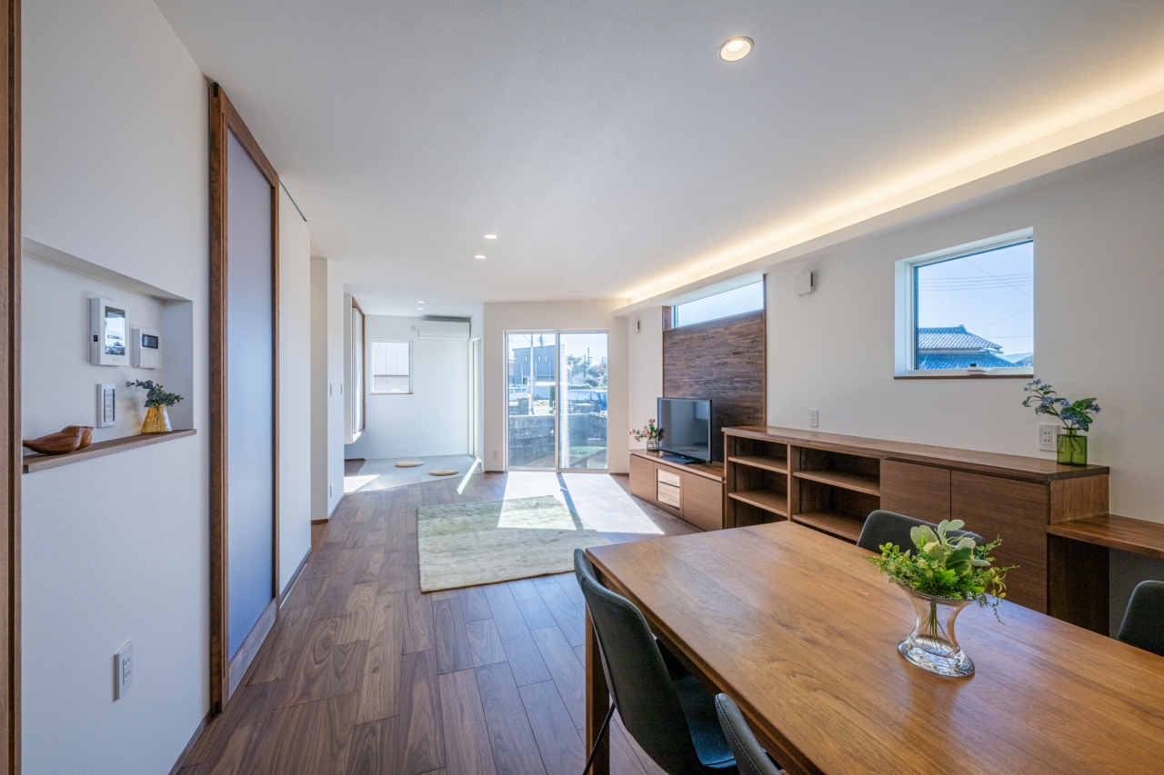角度をつけ真南に配置した掃き出し窓からLDKに光が伸びる。