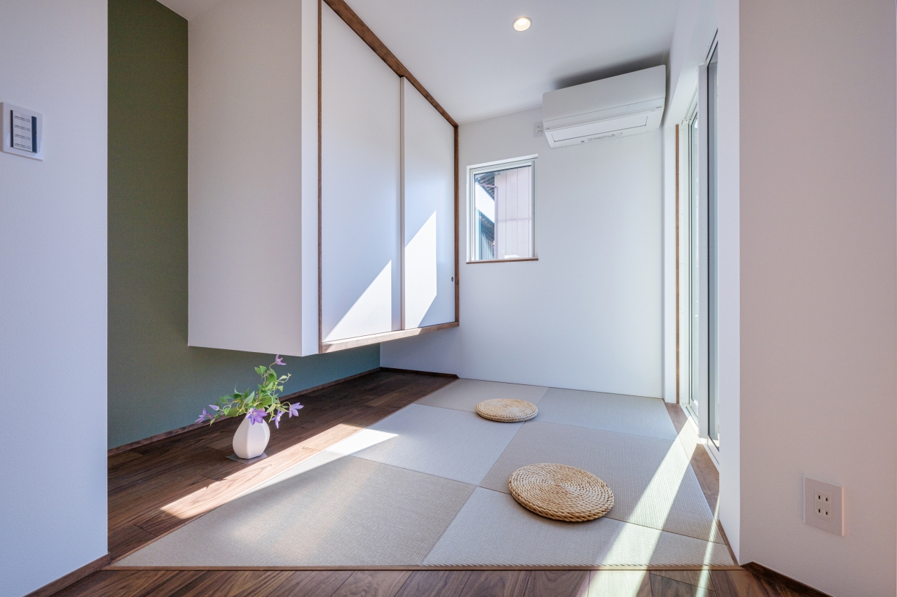 LDKとつながる2.5畳のタタミスペースと収納。吊り収納にすることで奥行きが感じられる。