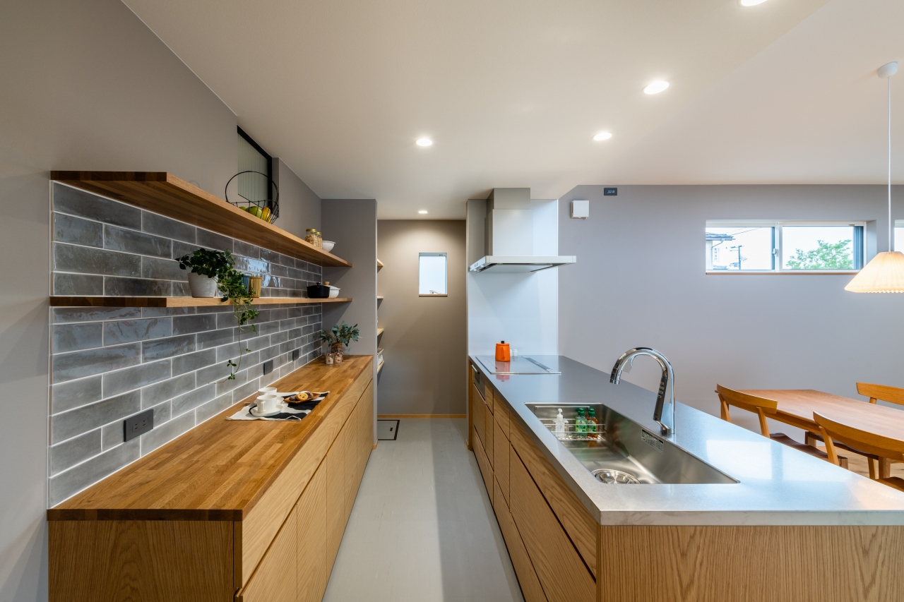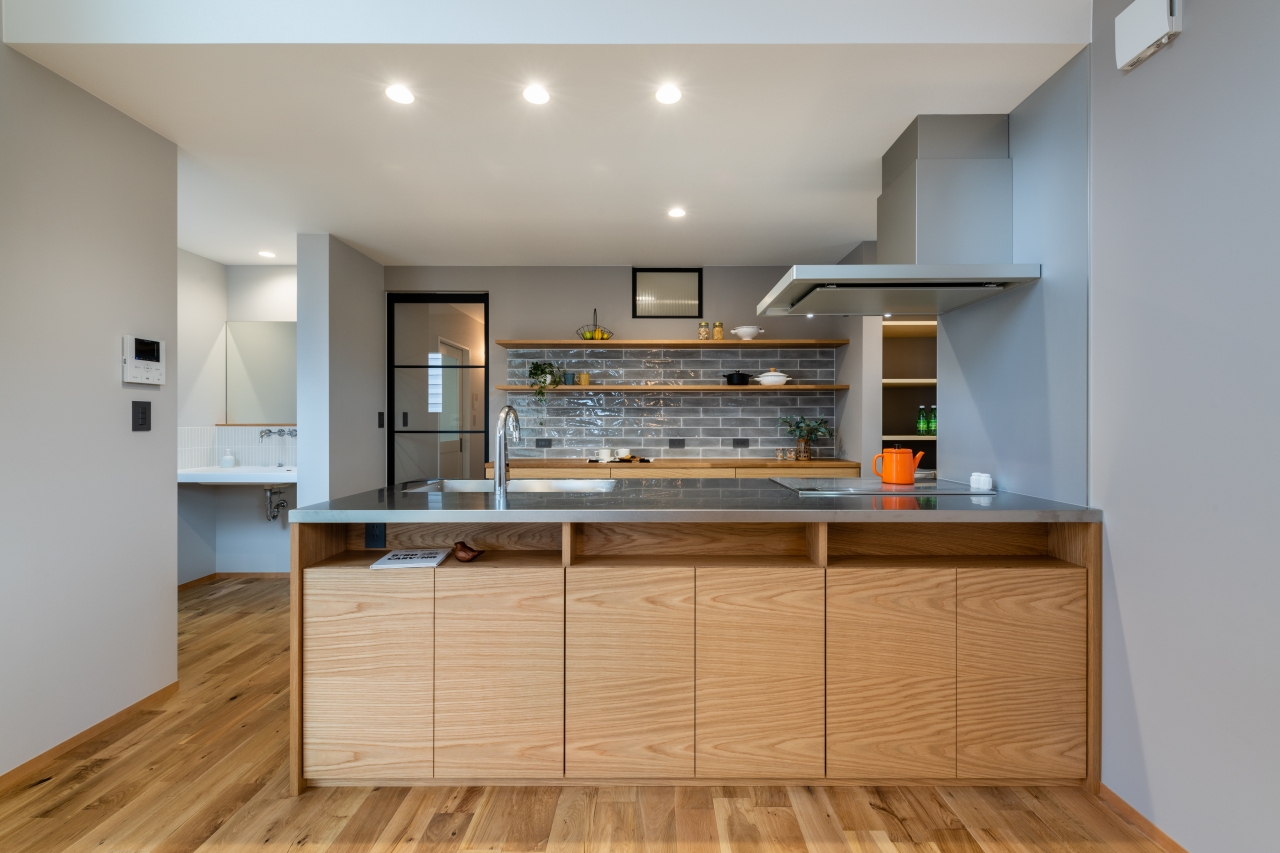 木製の造作キッチンに合わせて、背面収納もコーディネート
