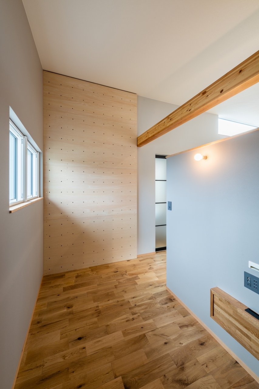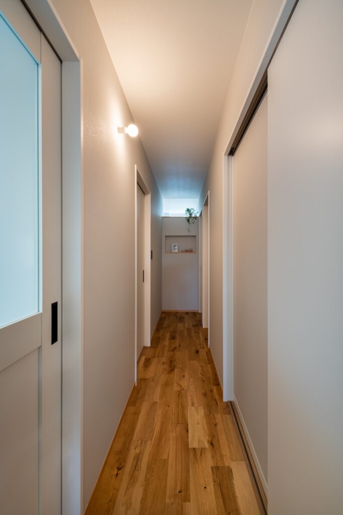 窓のない廊下の突き当りには欄間を設け、寝室からの間接的な光を取り込んだ