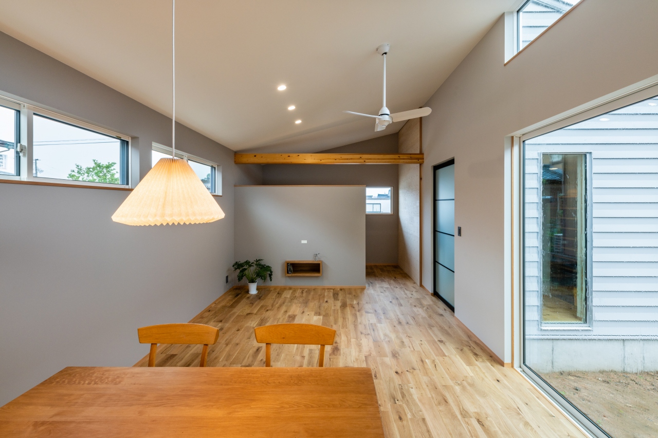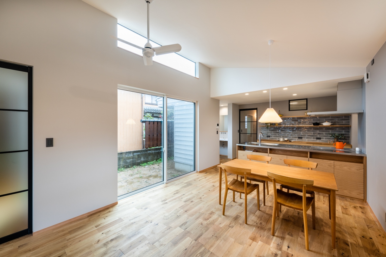 中庭に大きく開いた勾配天井のLDK
