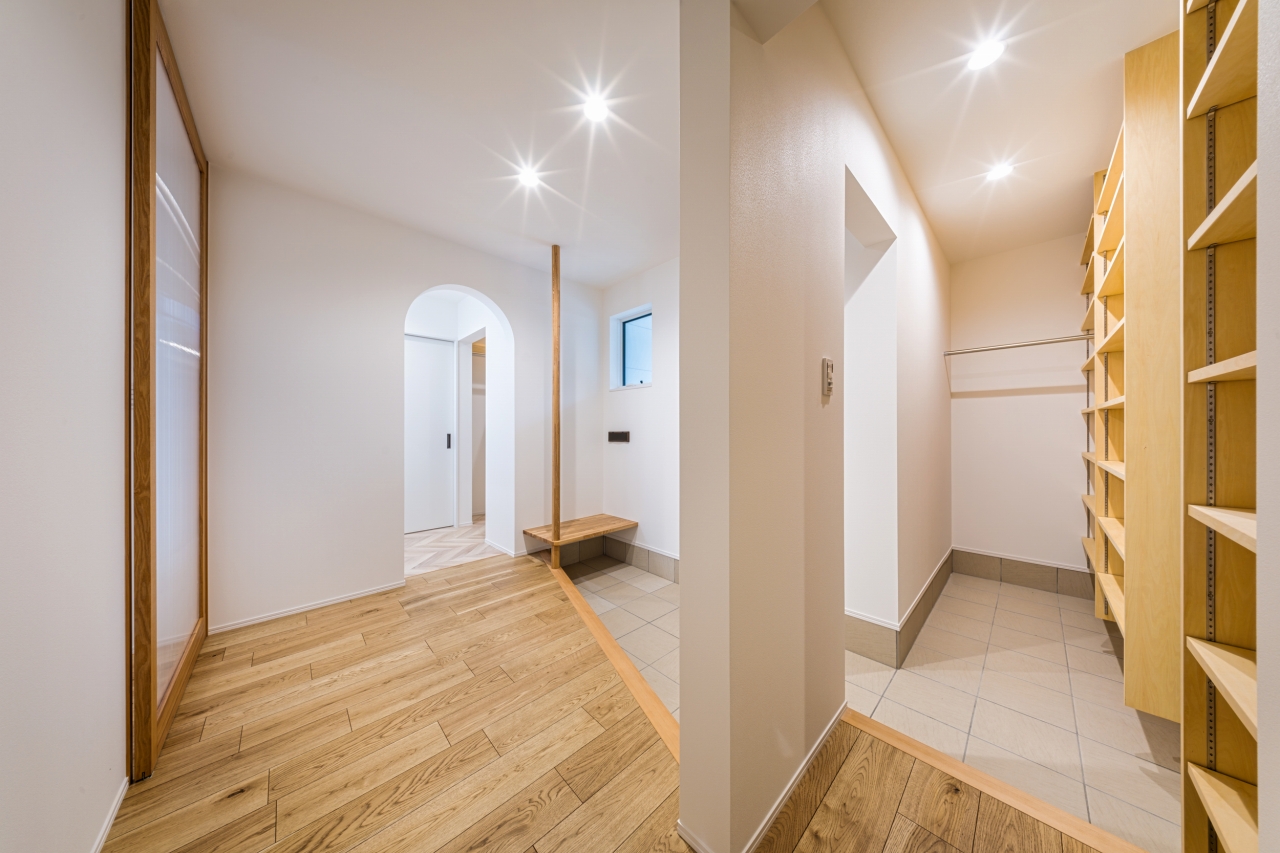 大家族用のシューズクロークと玄関ホール。シューズクロークからは4.5畳の外収納へもアクセスできる。