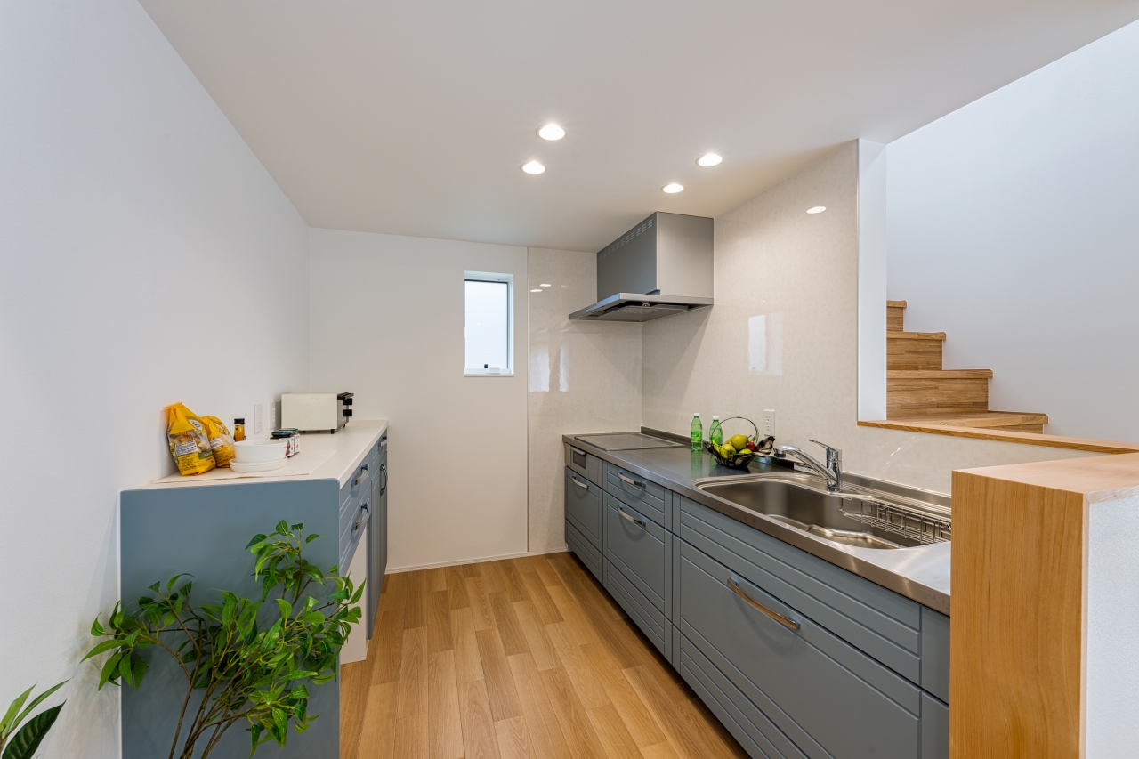 カラーとデザインがお気に入りのキッチン。背面収納も同じく揃え統一感を。