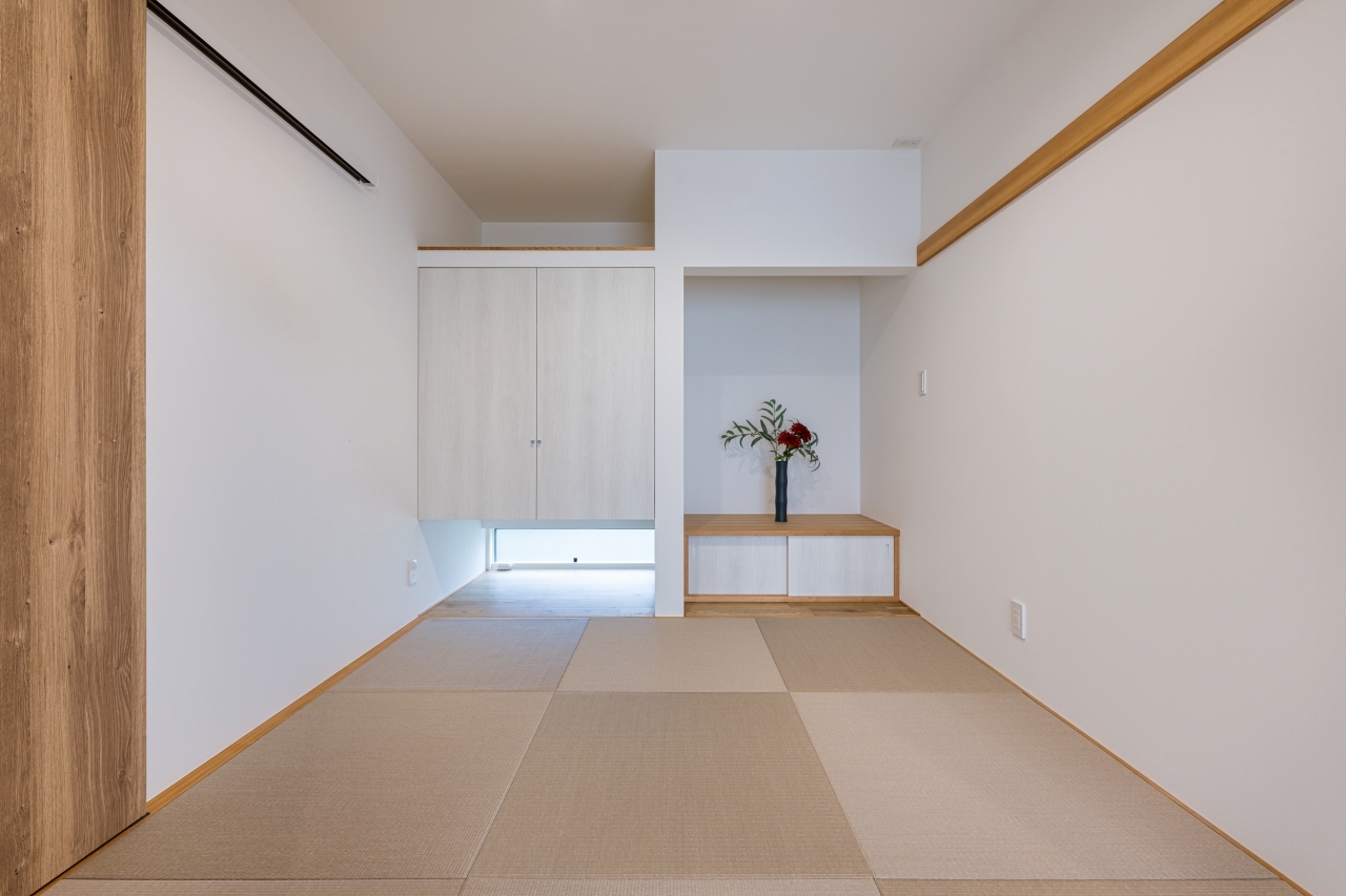つながるリビングと色合いは合わせながらも、神棚スペースや地袋、長押を造作。