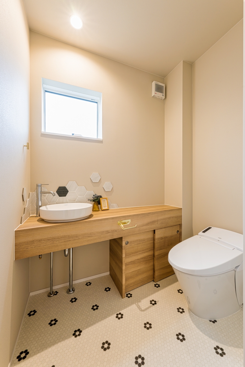幅にゆとりを持たせたWC。収納カウンターは台形状にすることで、大きな手洗いボウルも設置可能に。