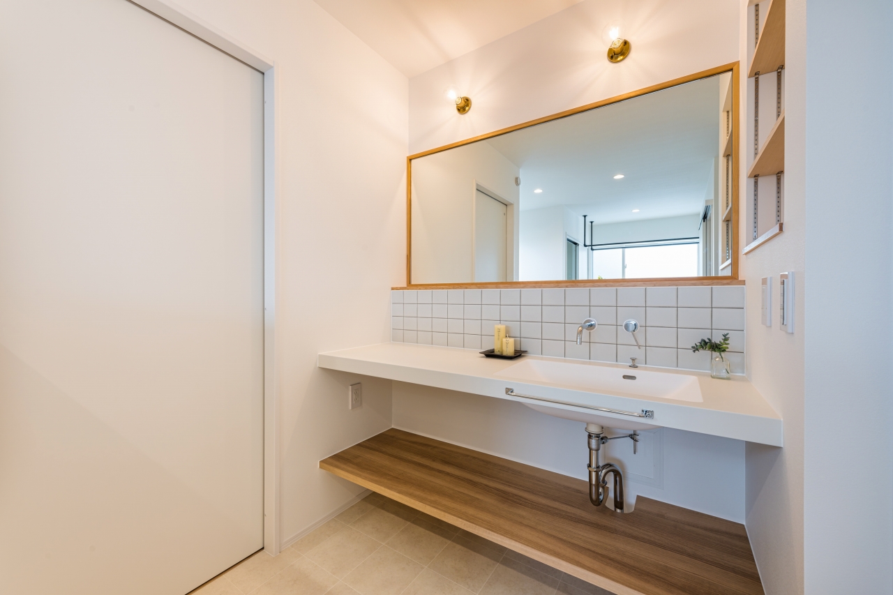 混雑時でも並んで楽々支度ができる幅広造作洗面。