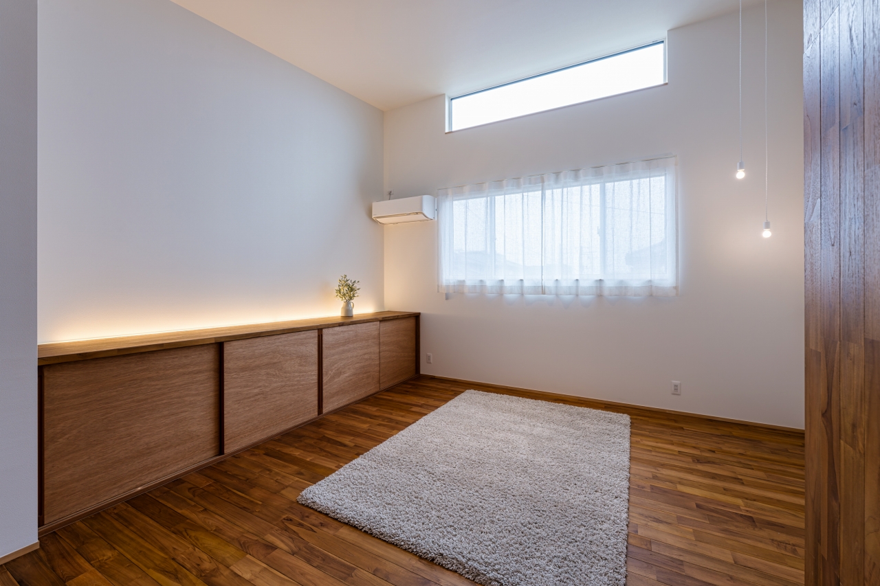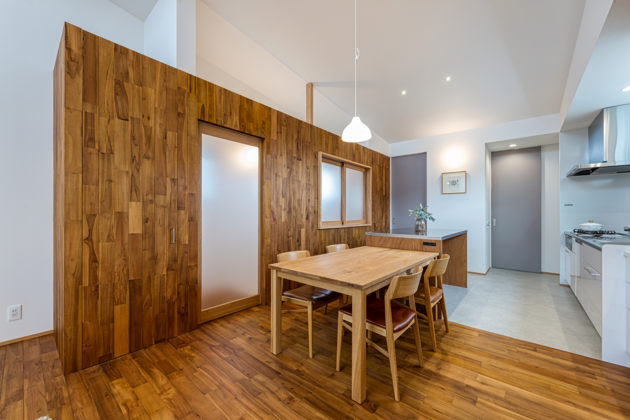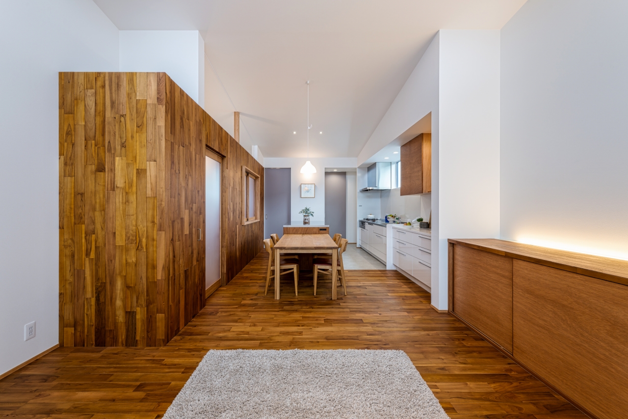 壁面までチークの床材を張り上げ、つながりのある空間に。