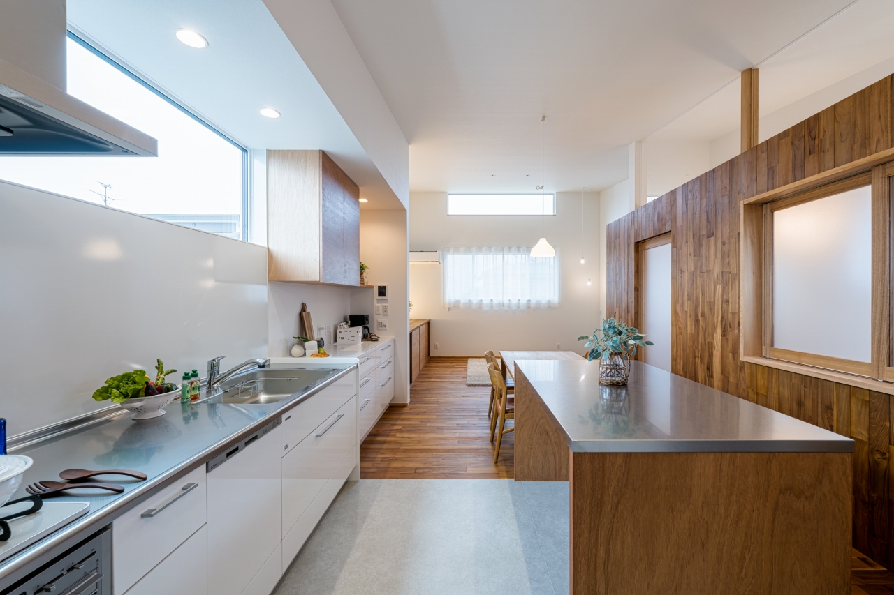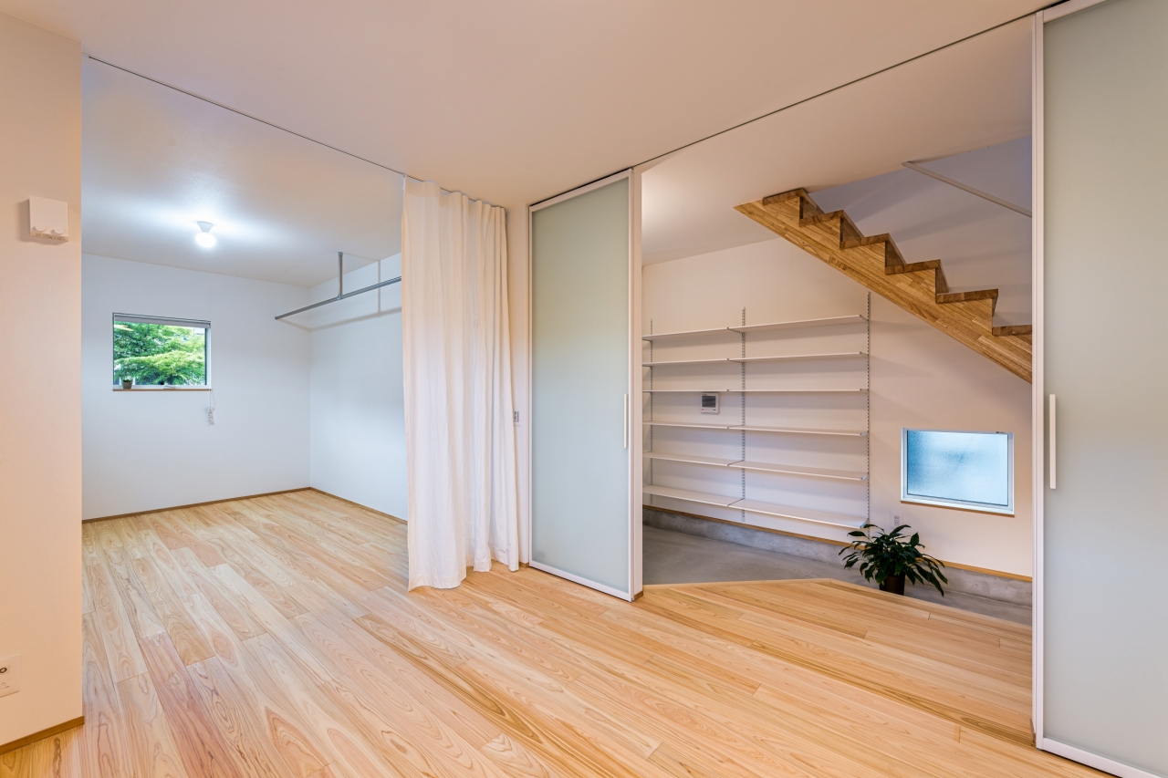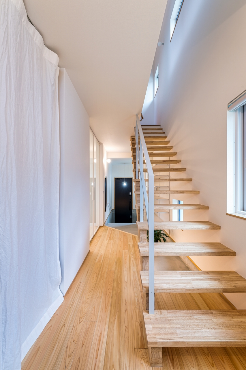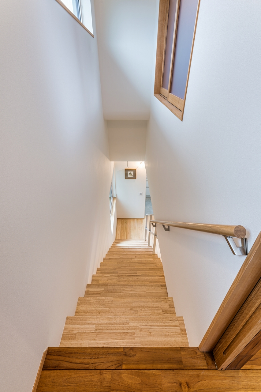 南側の窓から1Fへ、内窓を通して2Fへ光を運ぶ階段室。