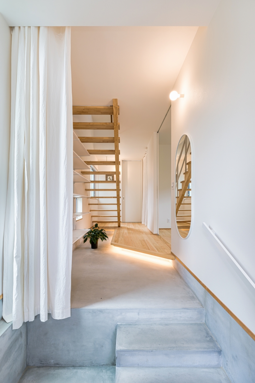 モルタルの床と間接照明で奥行きのある玄関。水害対策で基礎を高くし、手前を内土間に。