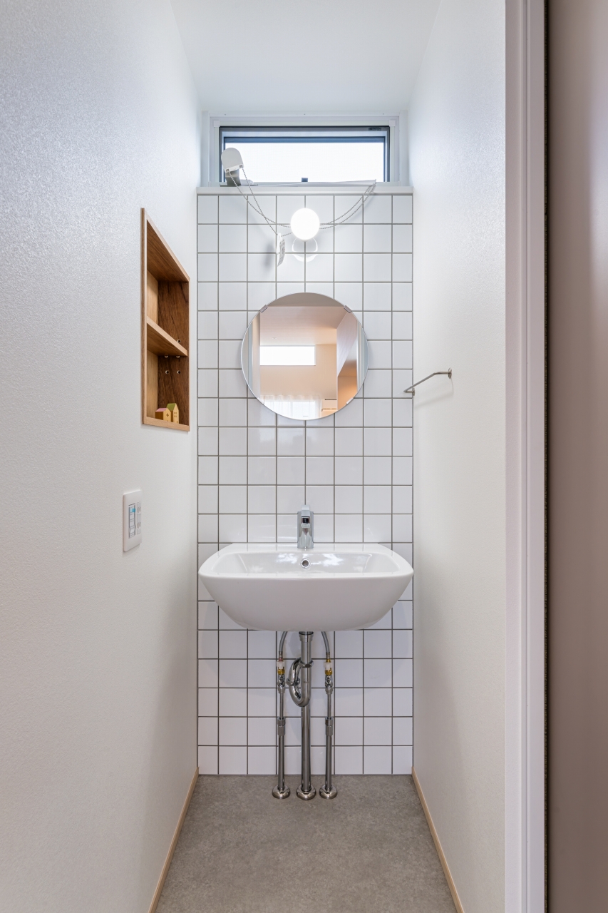 洗面器やタイルを白で統一した洗面室。丸形の鏡が柔らかさを生み出す。