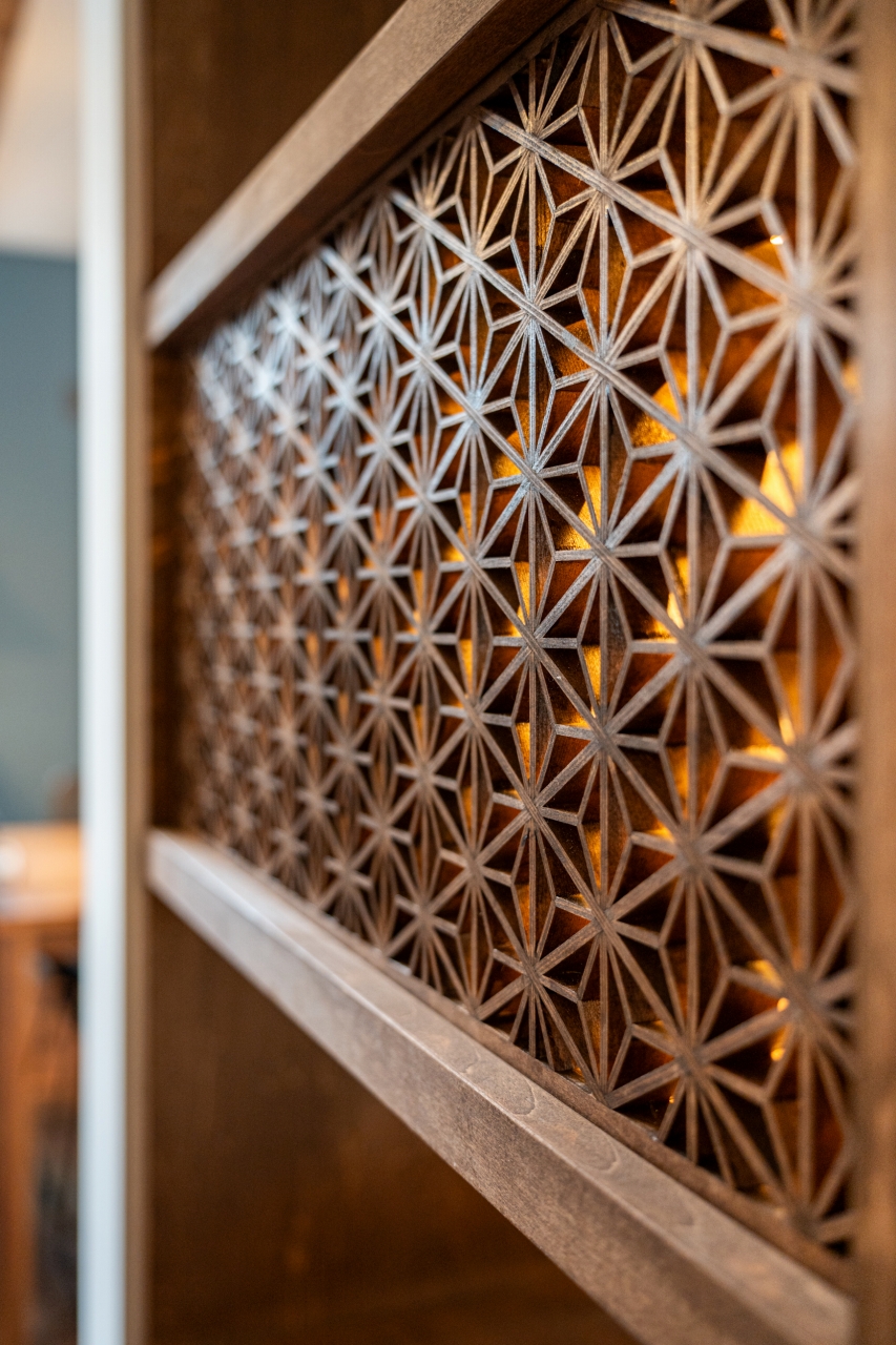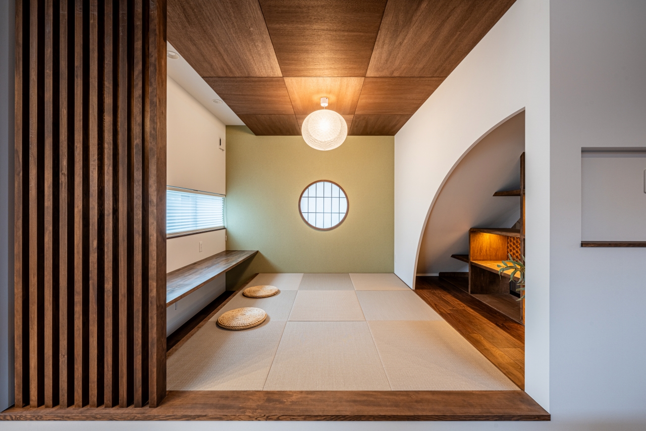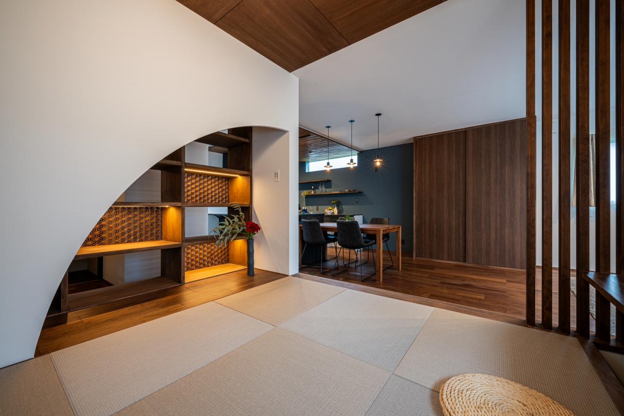 アールの壁と組子棚の和室。