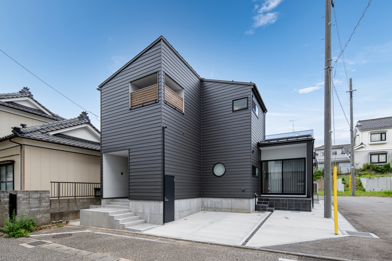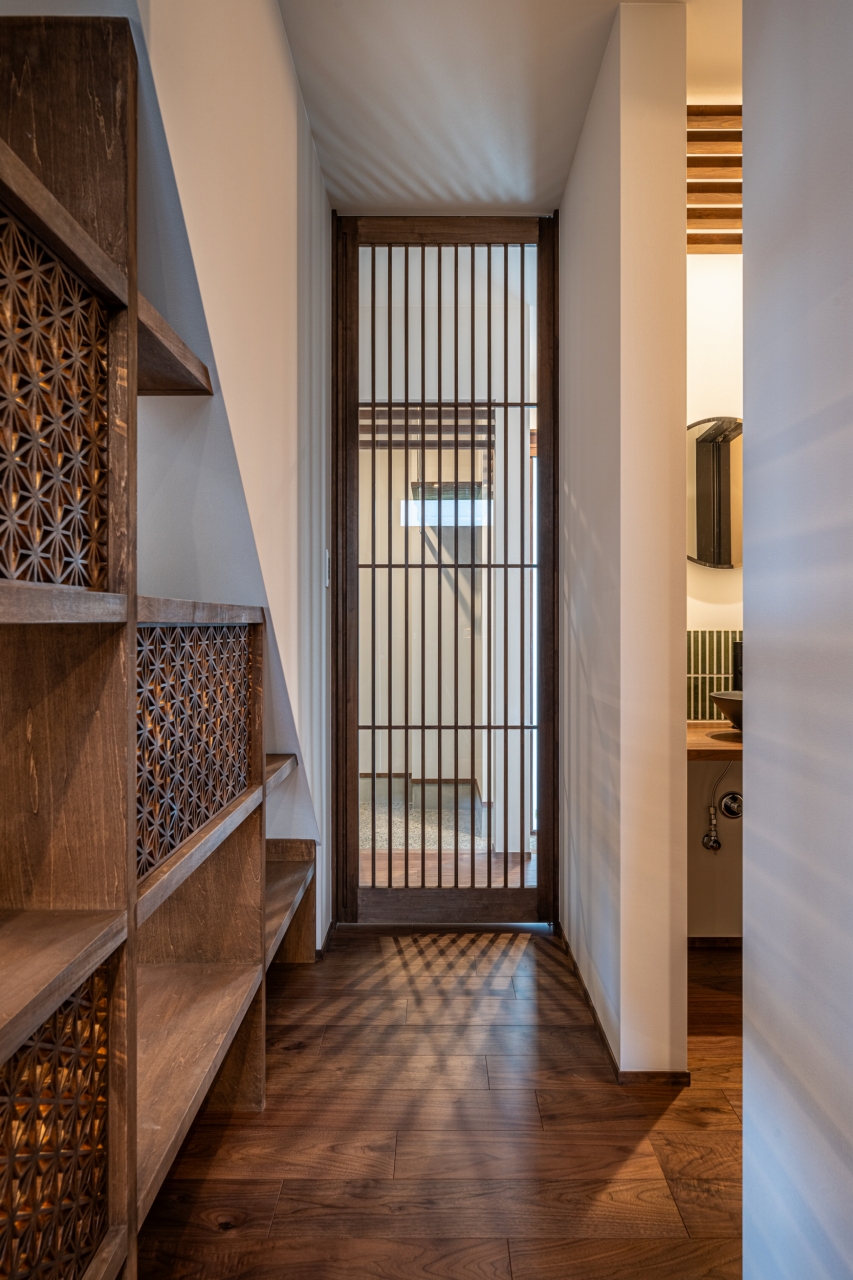 ベランダの木格子がポイントの外観。