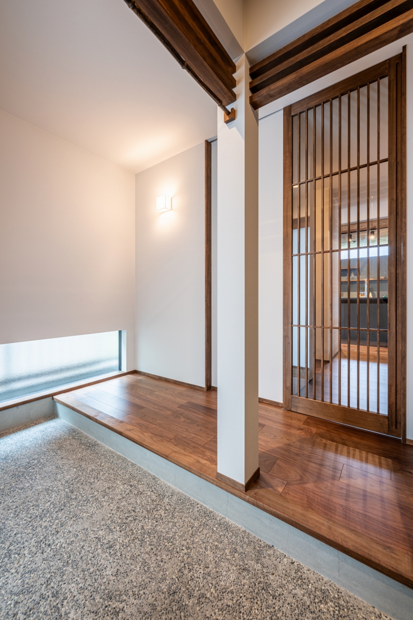 豆砂利洗い出しの玄関。地窓から光が入る。