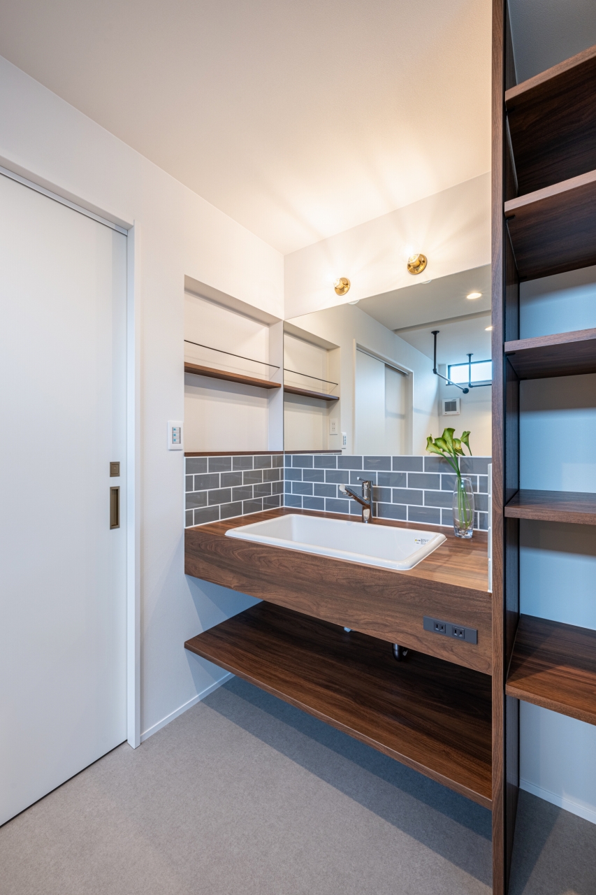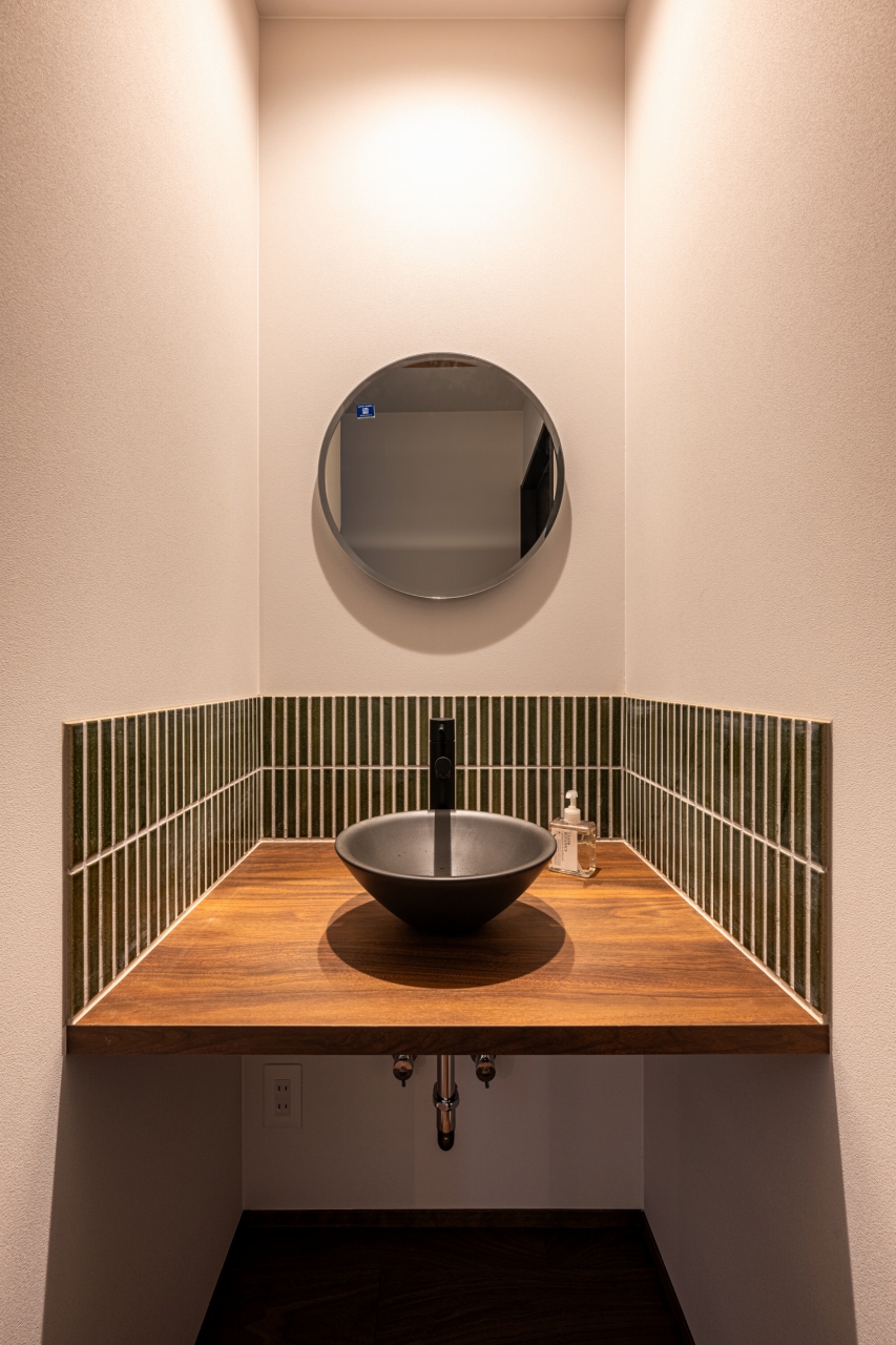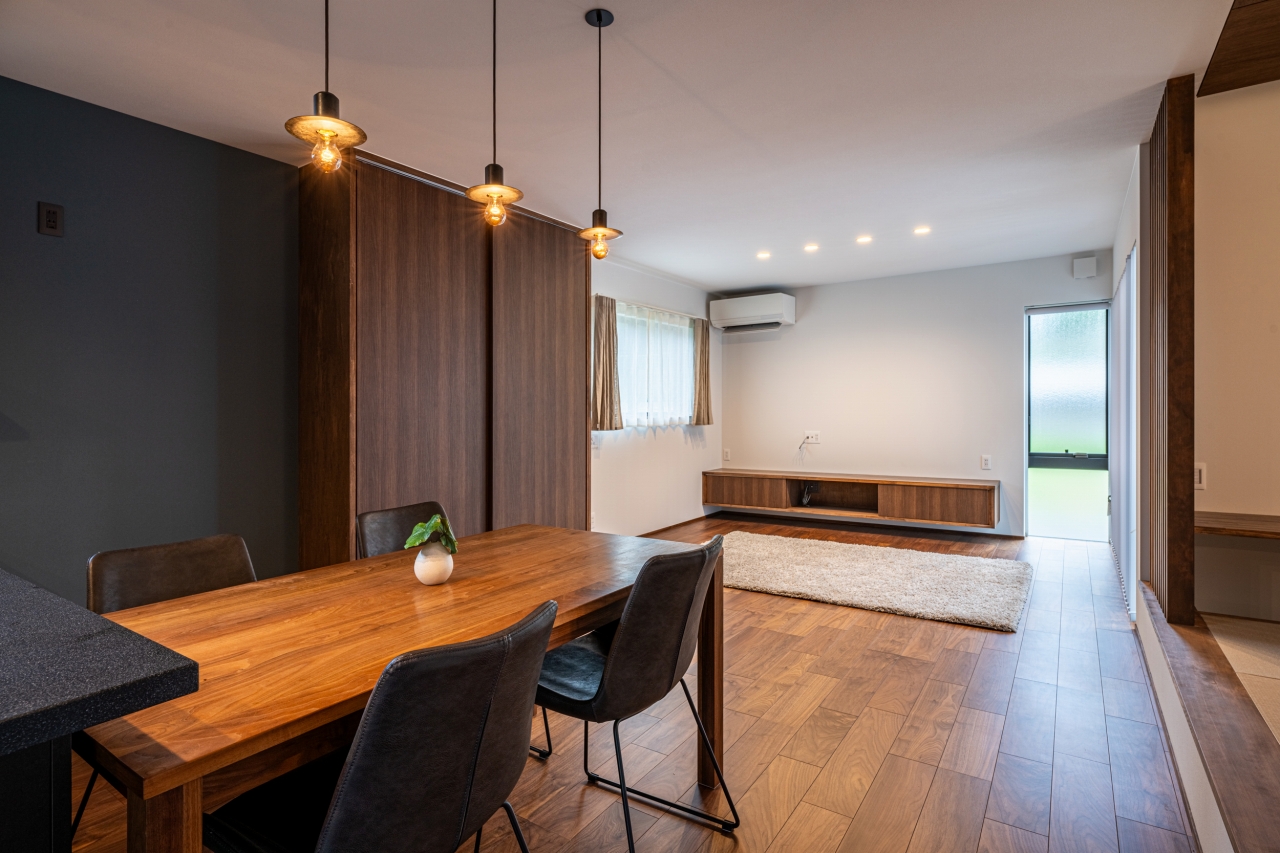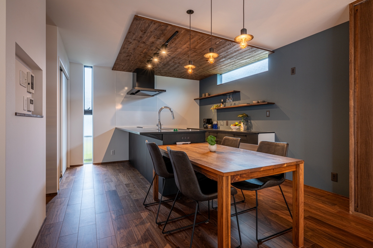 板張り天井とバースペースにもなるブラックキッチン。