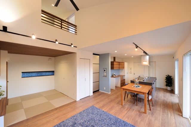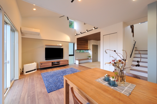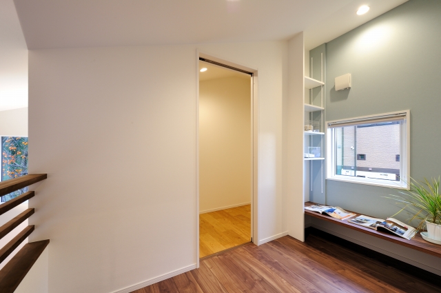 みんなが集まる空間はすべて北側へ 大きく開いた窓で 景色を絵のように切り取っていく 空のように高い天井から やさしい光が降りそそぐ