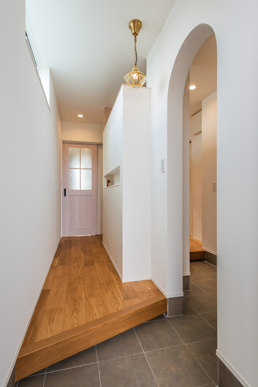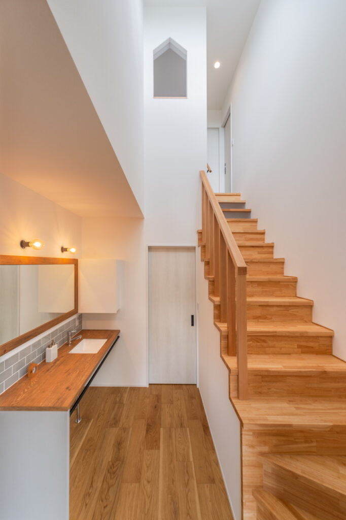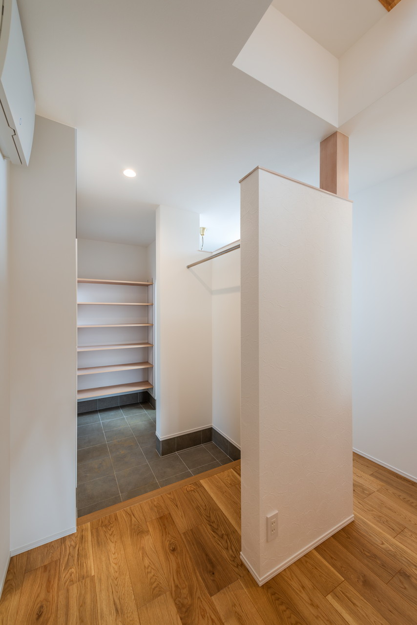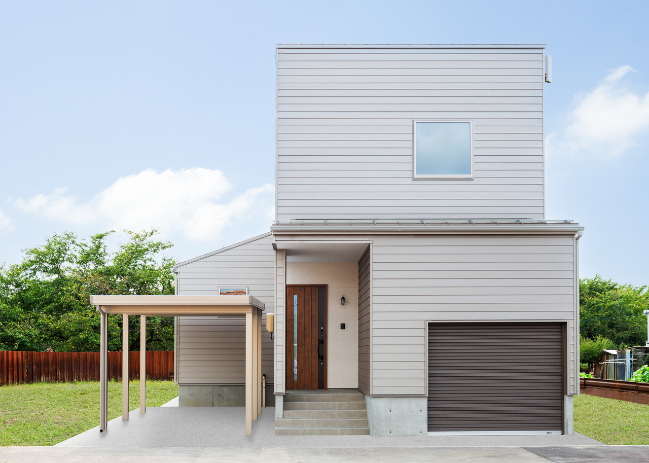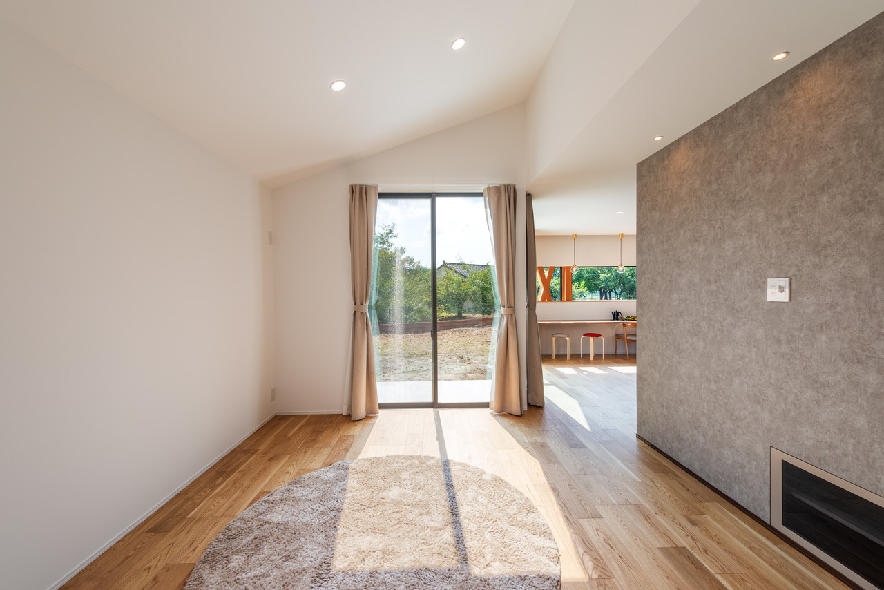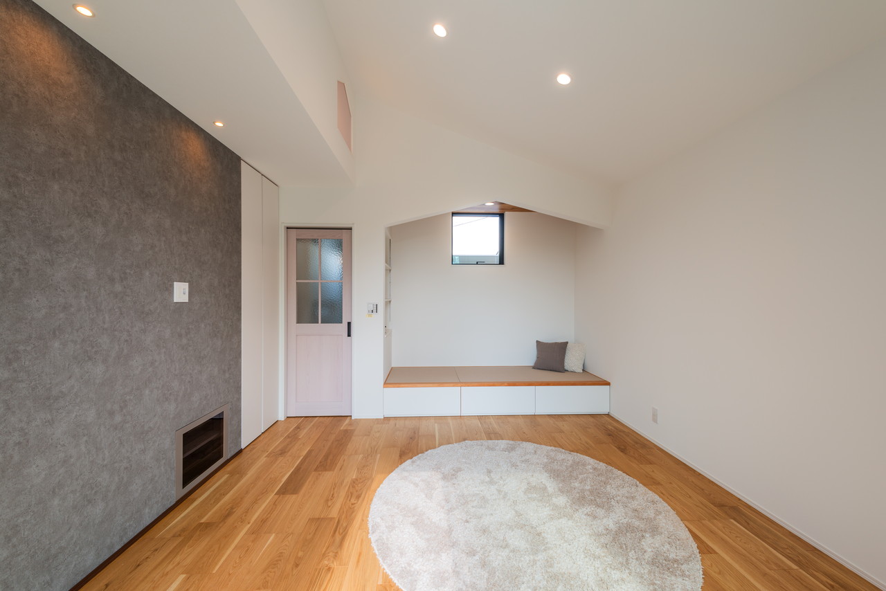 勾配天井のリビングで ゆったりと休日を過ごす夫 その隣で1畳半の畳の小上がりに ごろん、と寝転がる息子