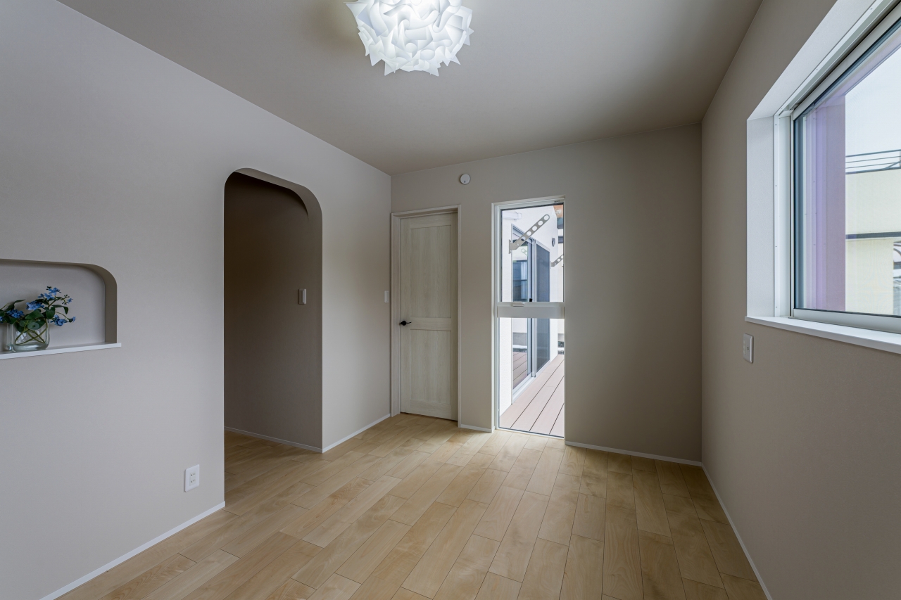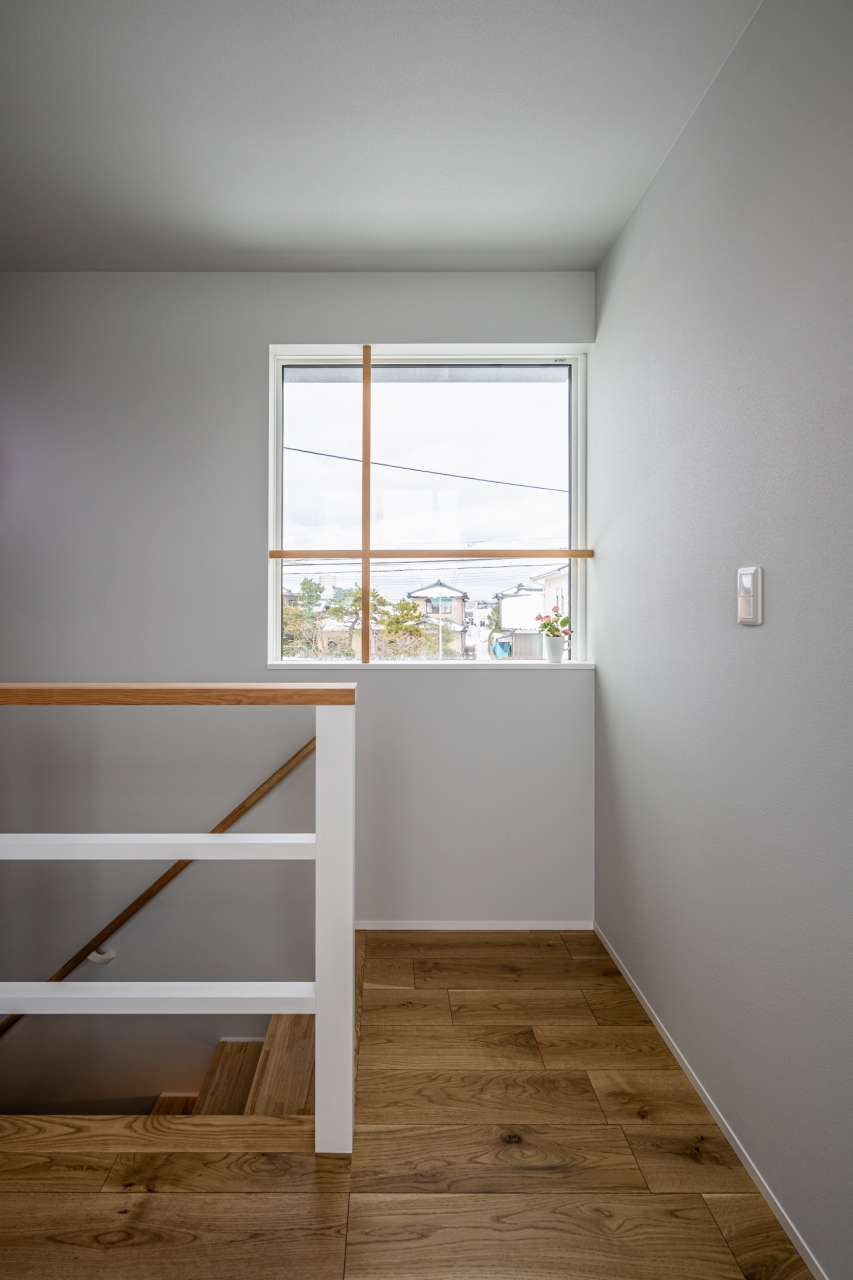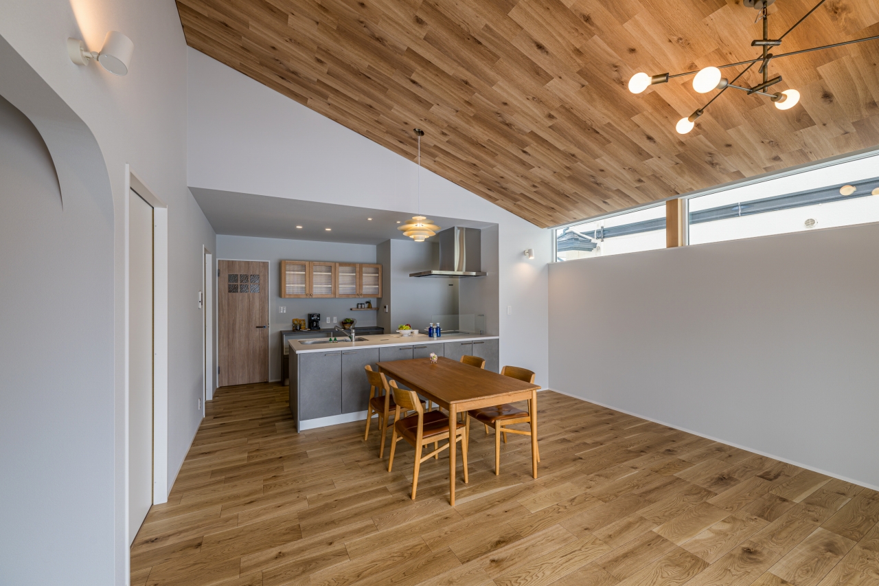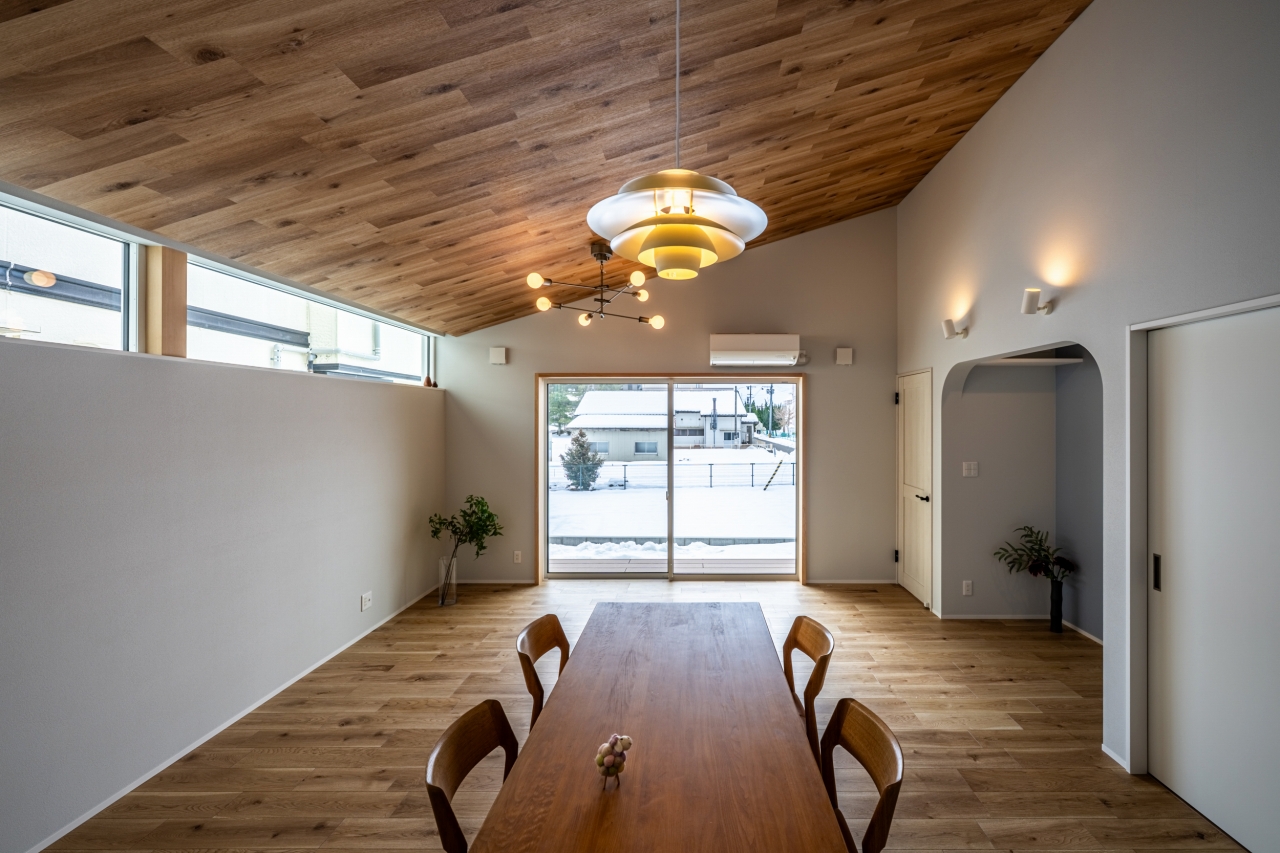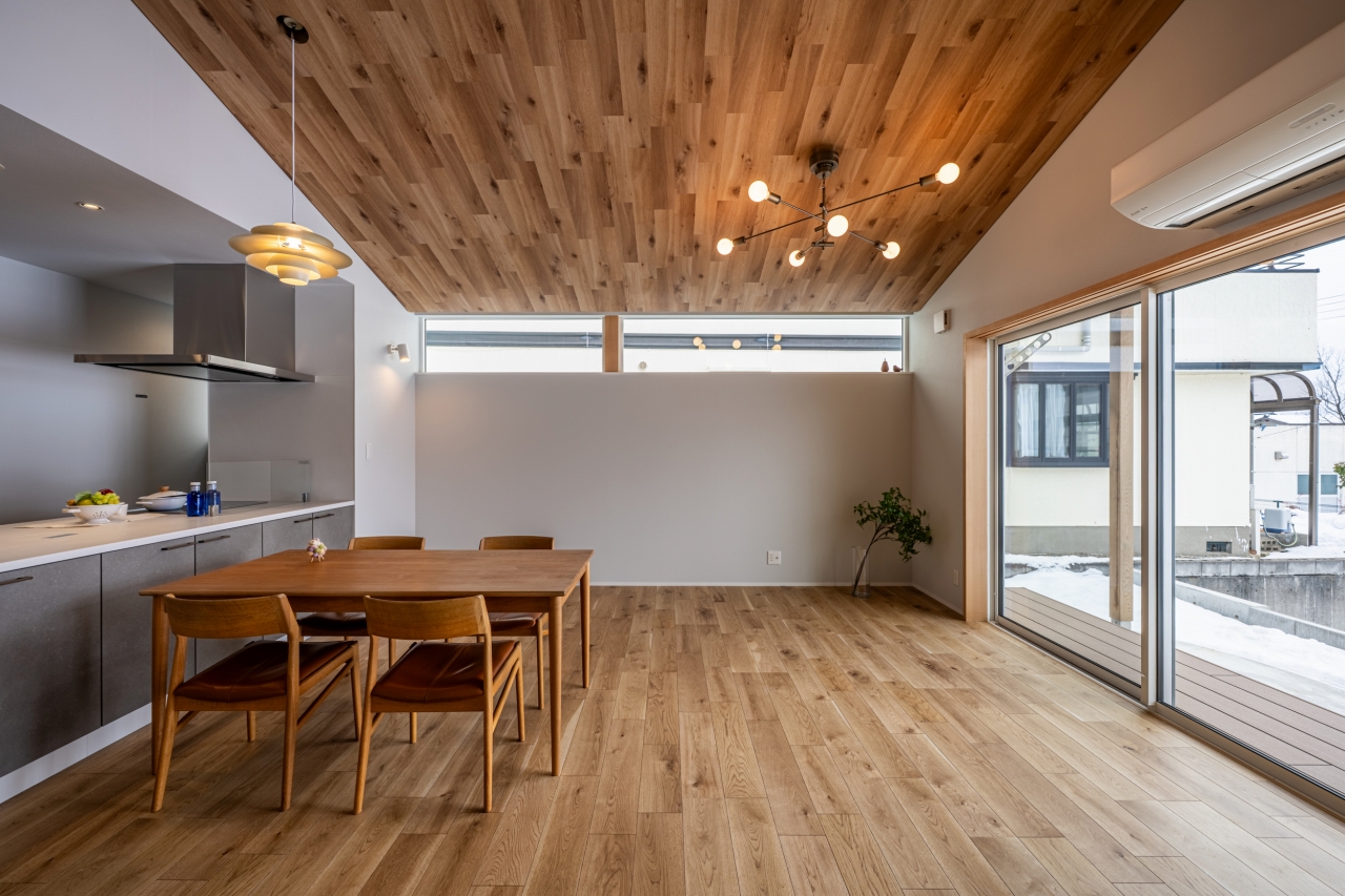 木目の勾配天井と連続ハイサイドで開放感を