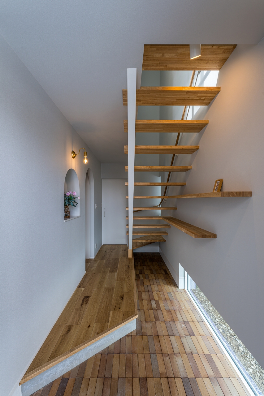 タイルの床とスケルトン階段が印象的な玄関ホール