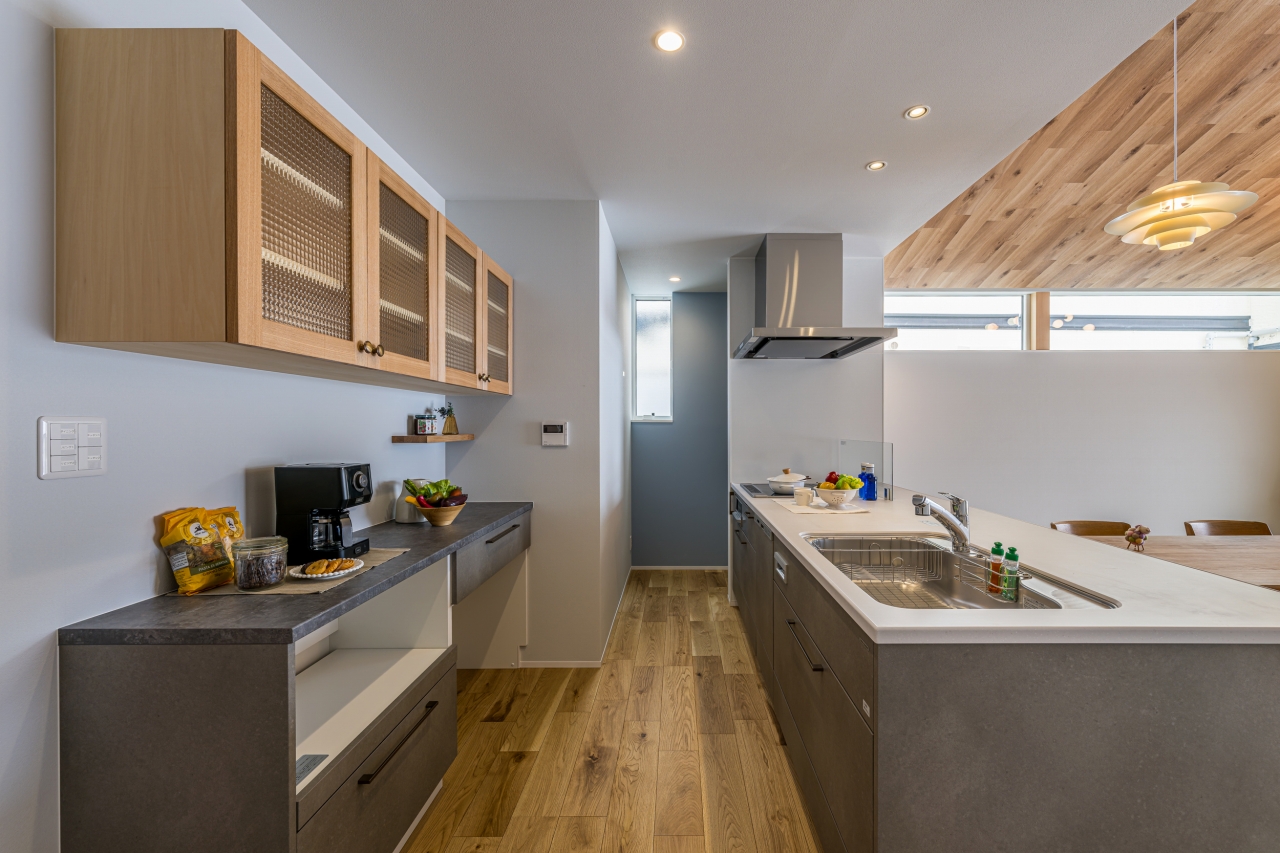 キッチンとカップボードの一体感と造作吊戸棚の組み合わせ