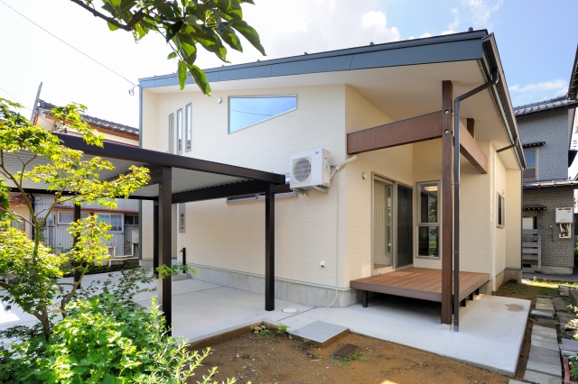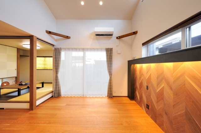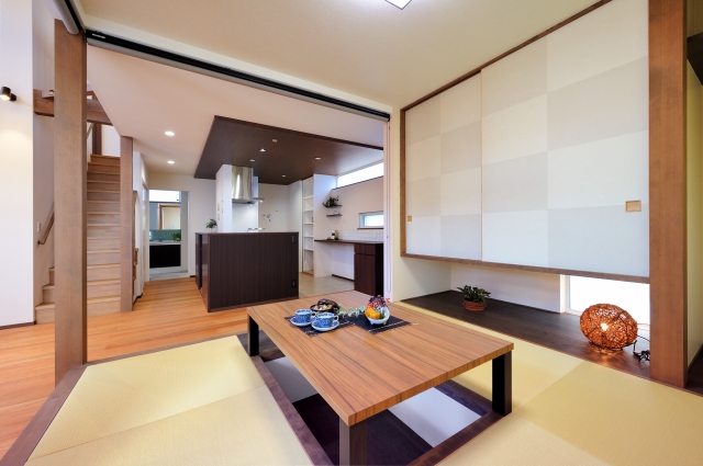 古民家の様な着色された構造材 大屋根のゆったりとした縁側 掘りごたつ、格子、借景 etc・・・・