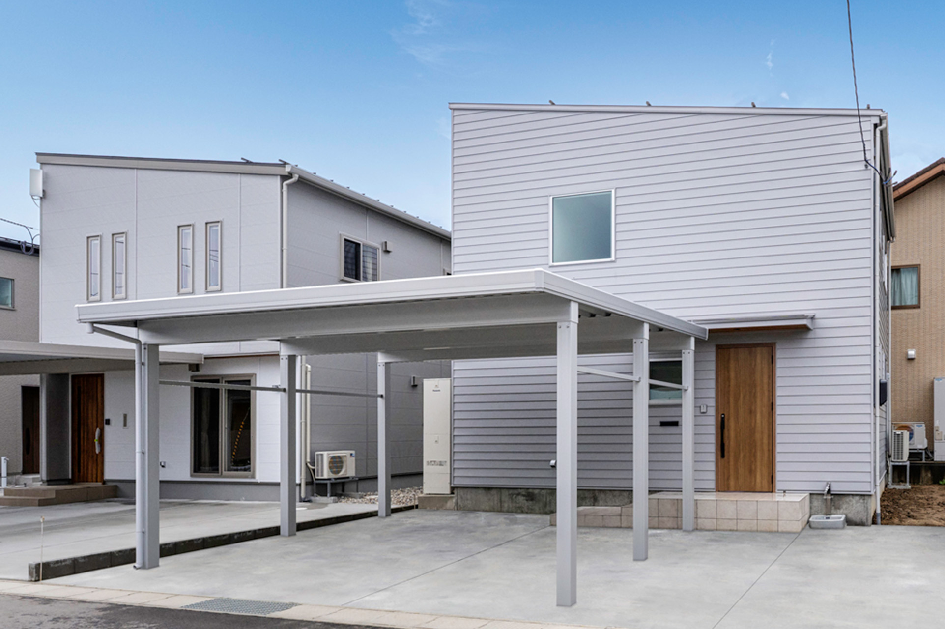 グレー×木目の中にスクエア窓を配置したシンプルな外観