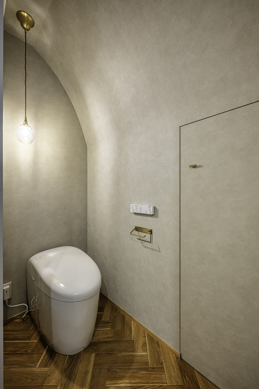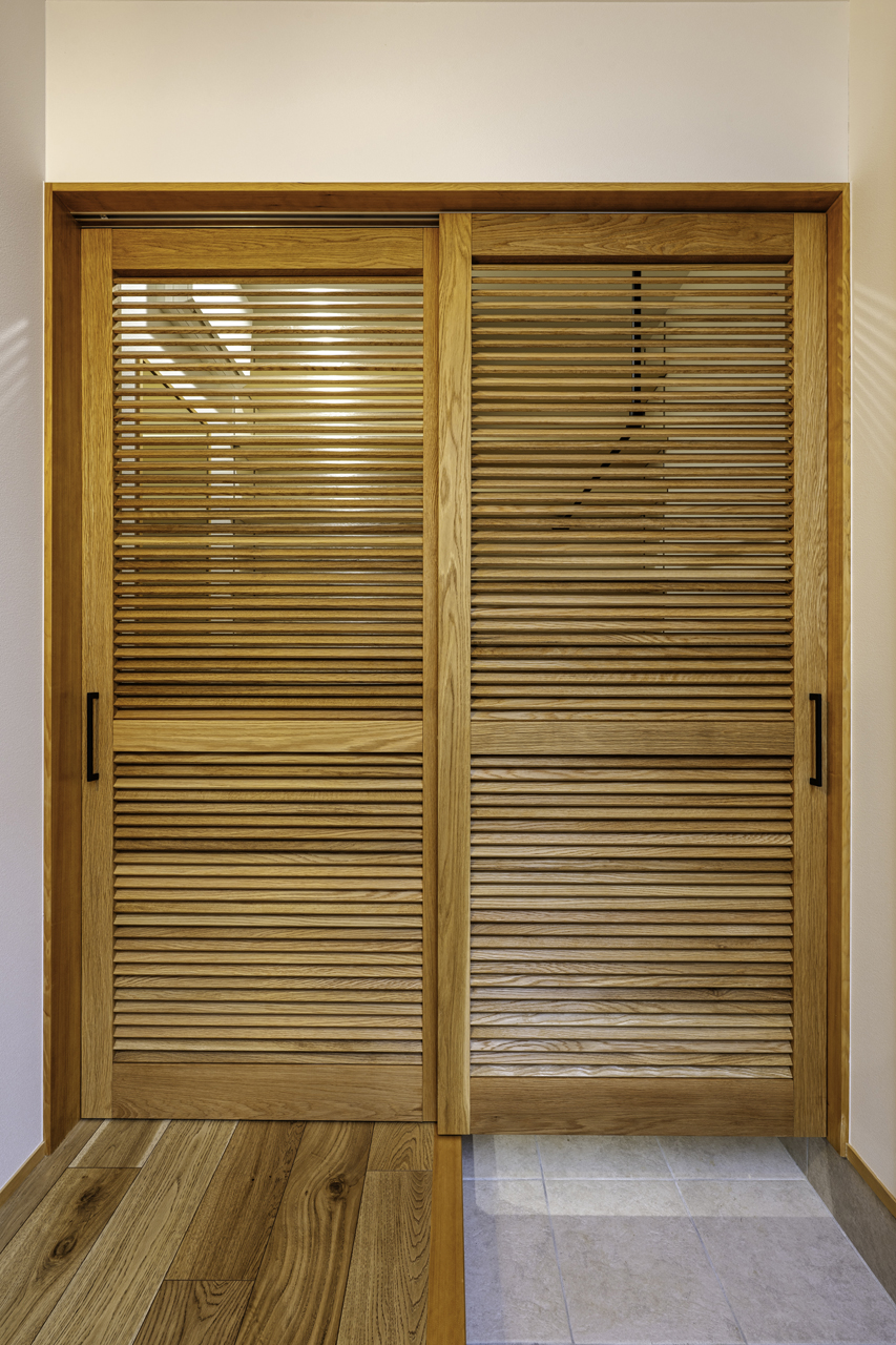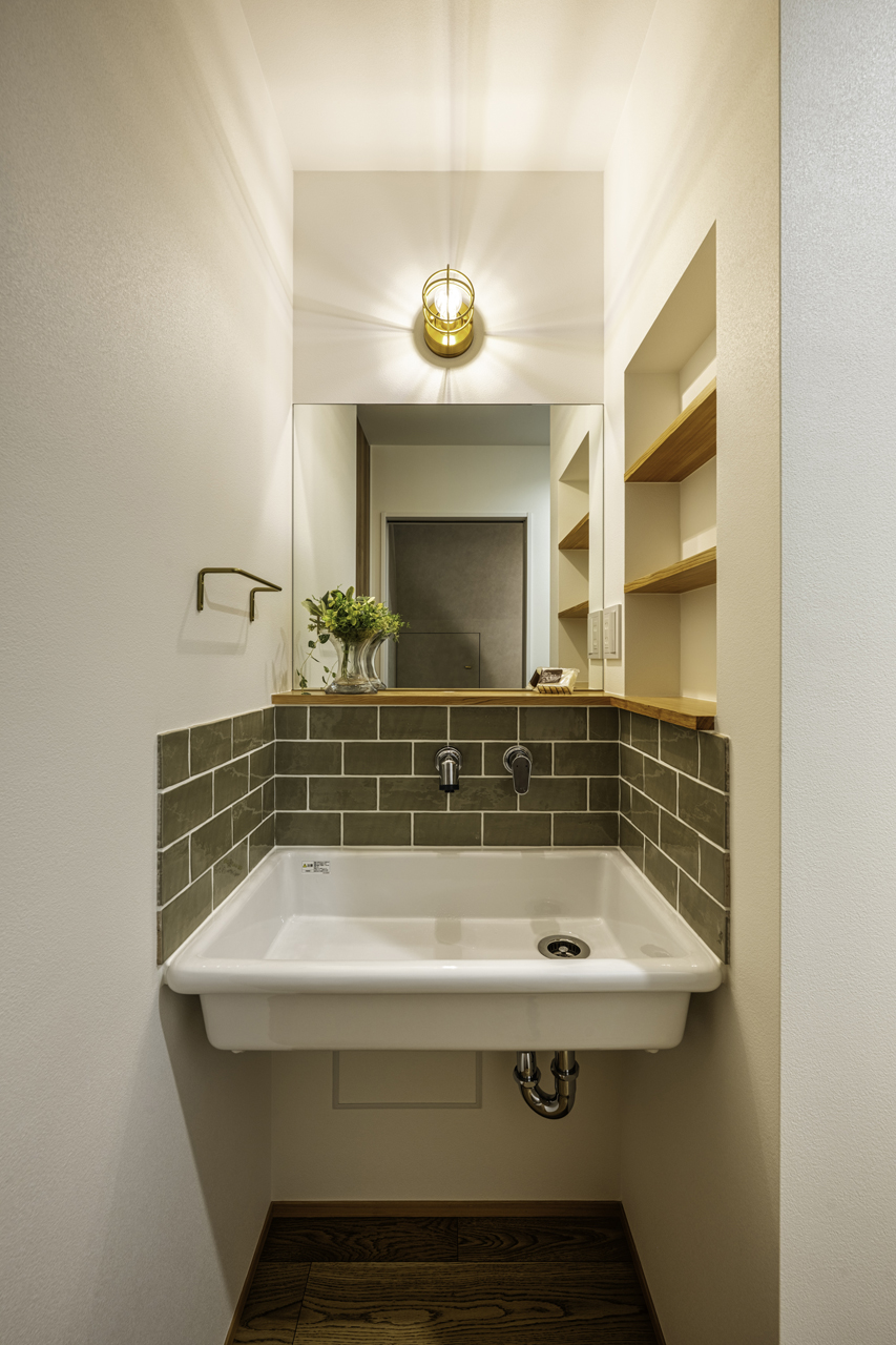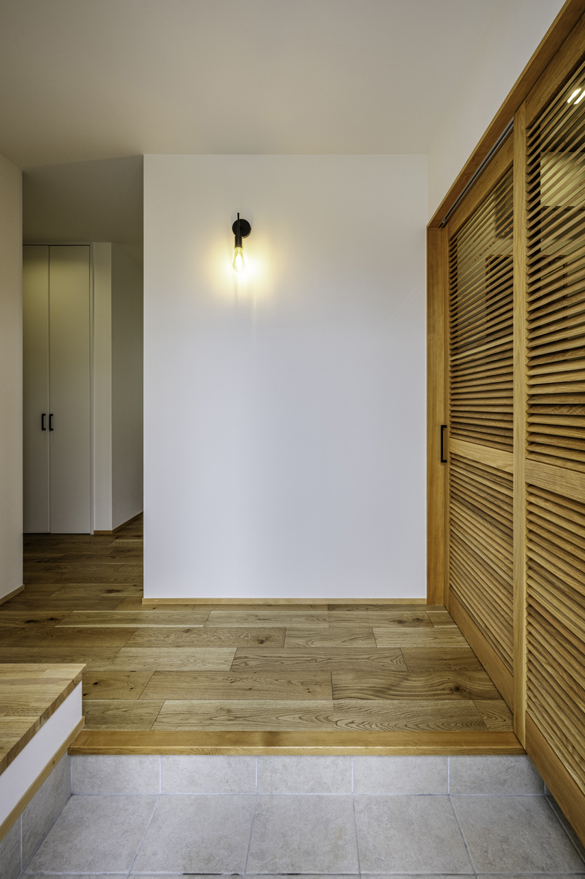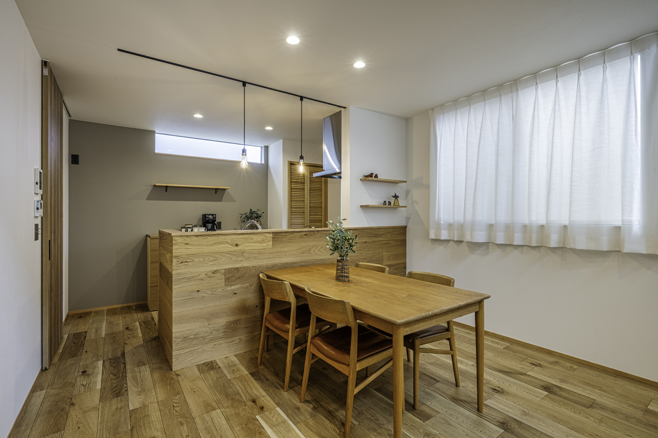 キッチンの腰壁はオークの無垢板を使い、経年変化を楽しめる