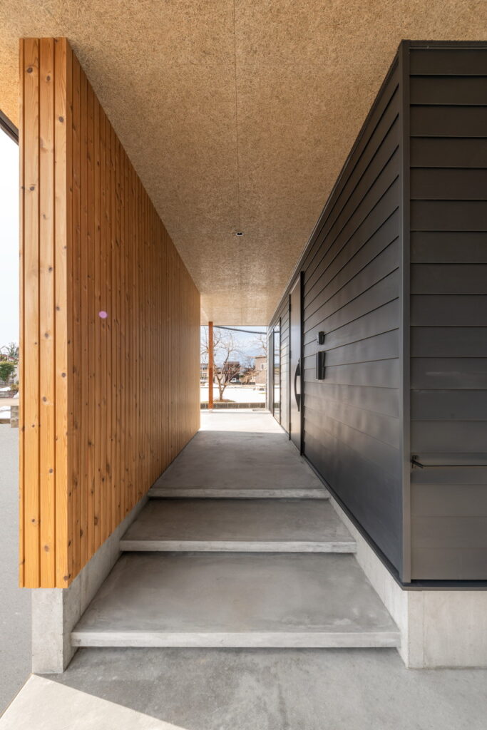 軒の深いアプローチ、ステップを浮かせる事でシンプルさを追求した