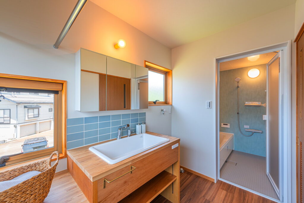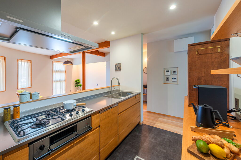 木製のキッチンを採用。対面キッチンとすることで家族とのコミュニケーションが生まれる。