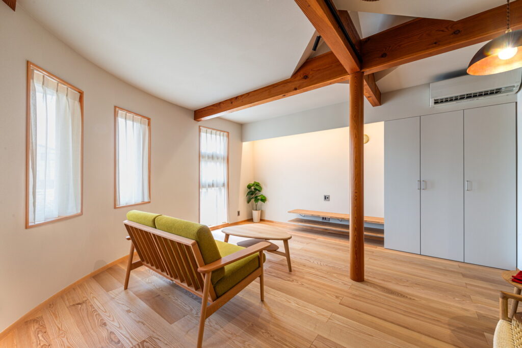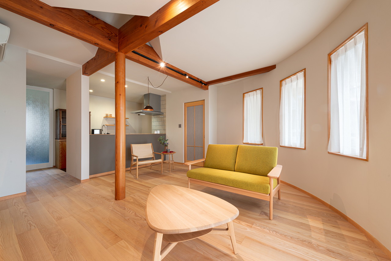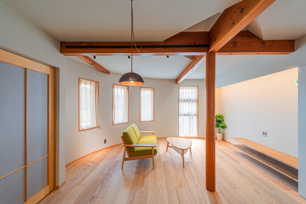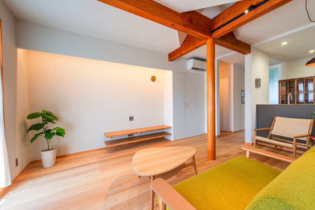 以前から表していた、丸柱・梁をそのまま生かし、リビングとダイニングを視覚的に仕切る