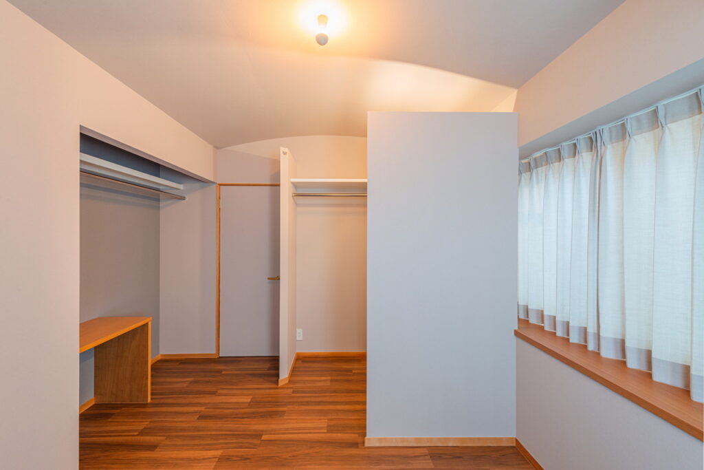 Rの天井をそのまま生かした。ウォークインクローゼットの壁を天井まで作らないことで広く見せる。
