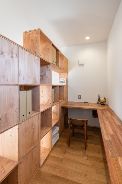 間仕切に本を収めて行くことにより、壁がパーテーションに変換し、空間のデコレーションが始まる。