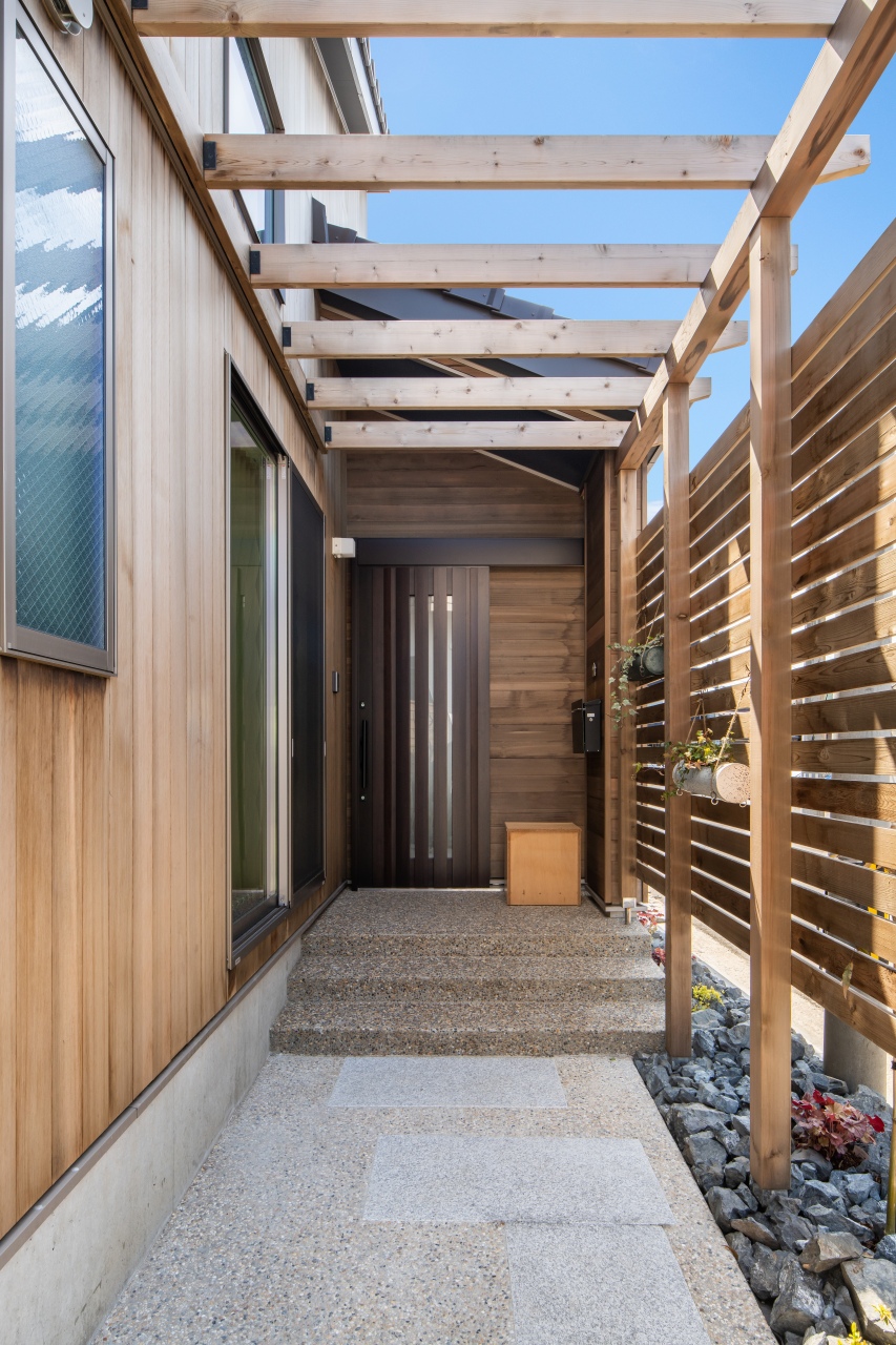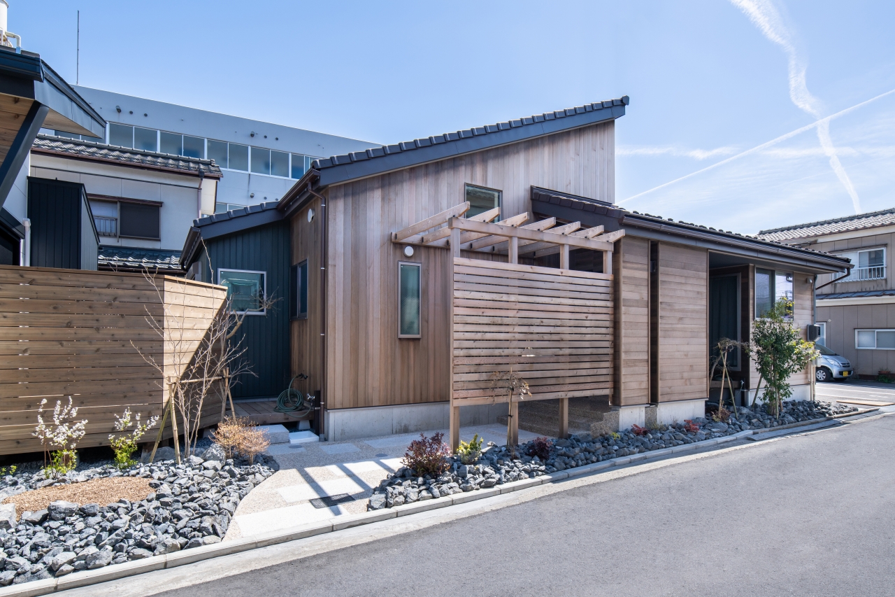 子世帯(写真左)とウッドデッキを介してつながる新しい2世帯住宅のカタチ。