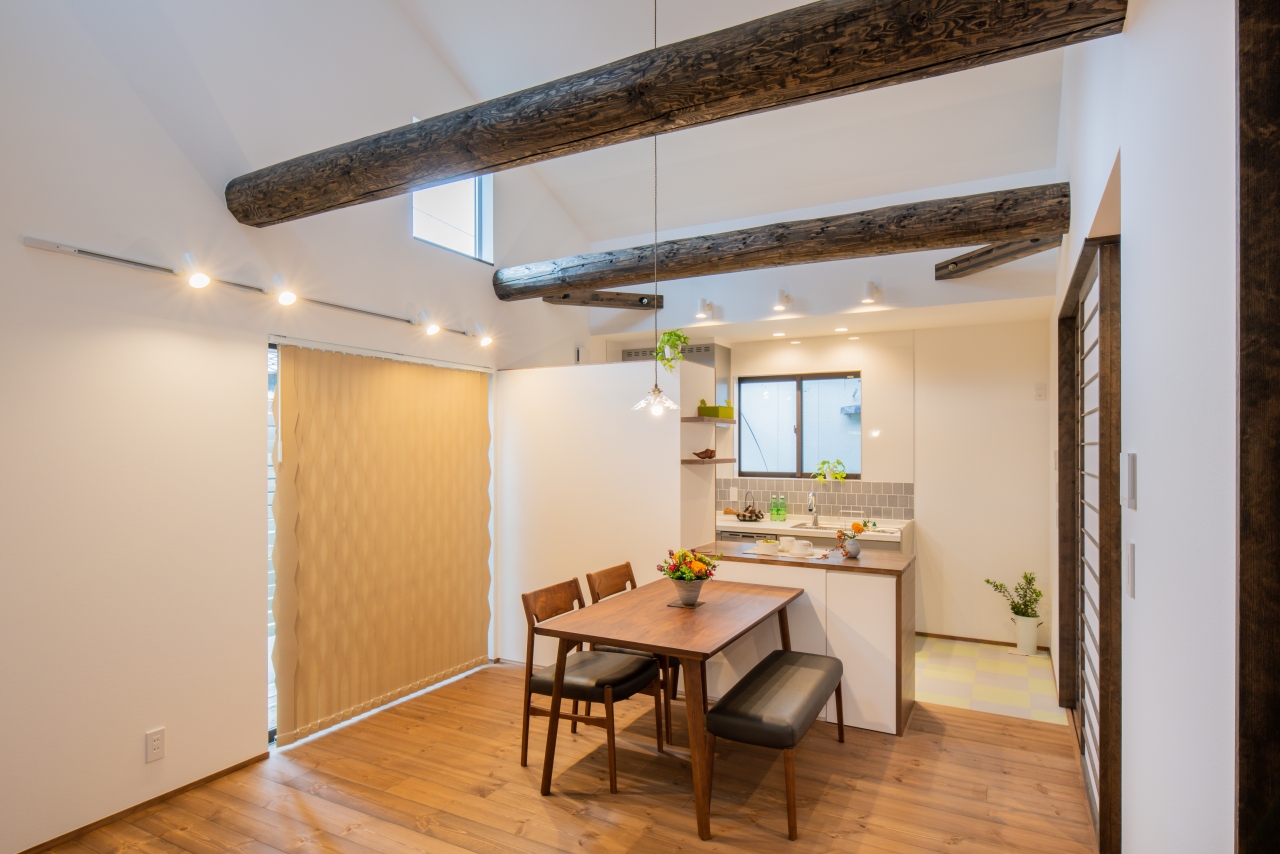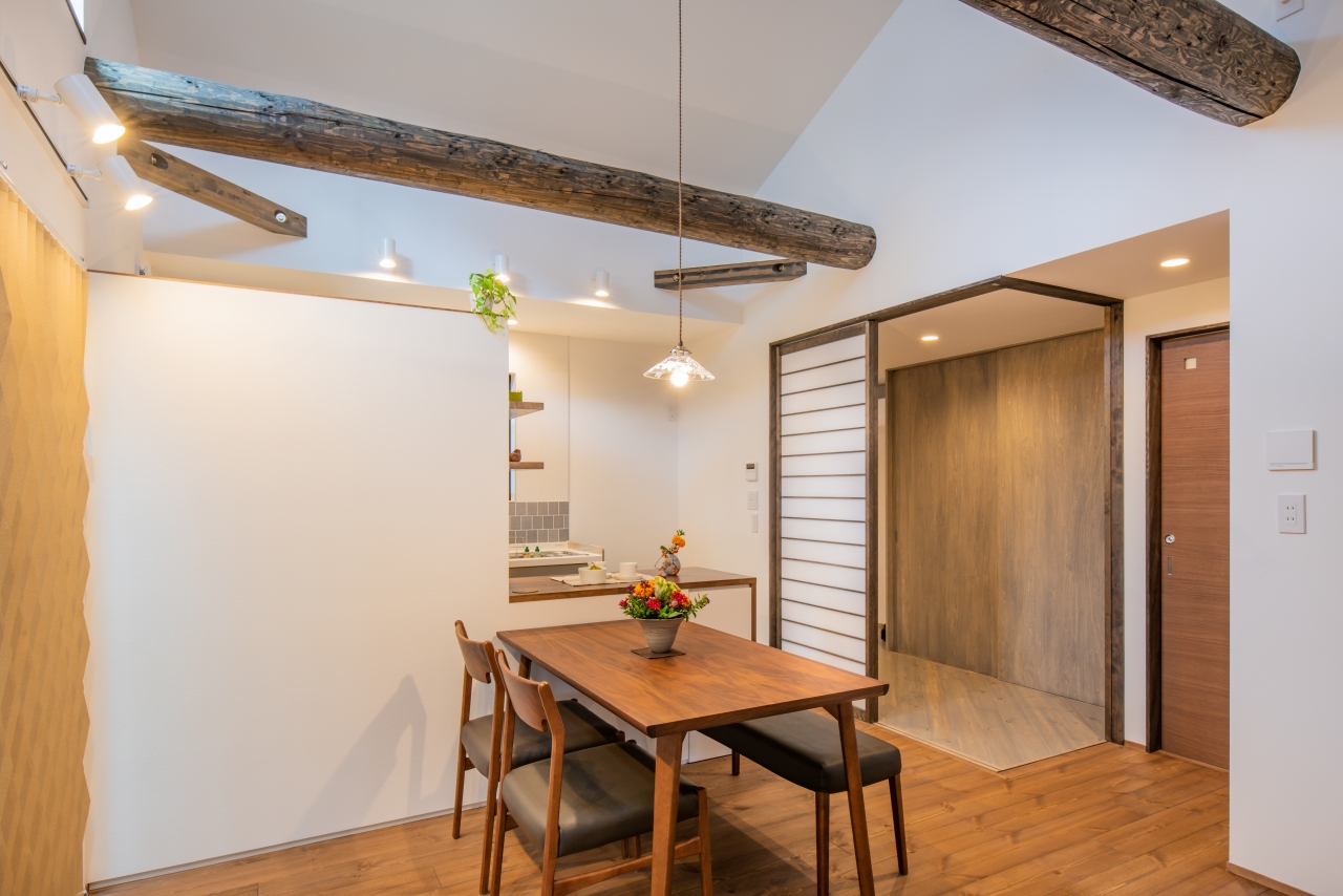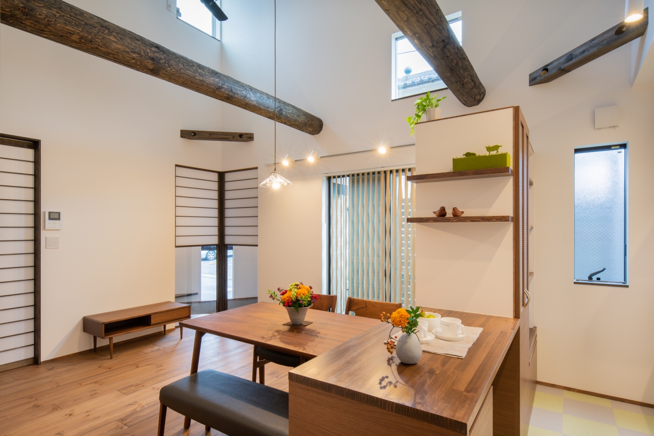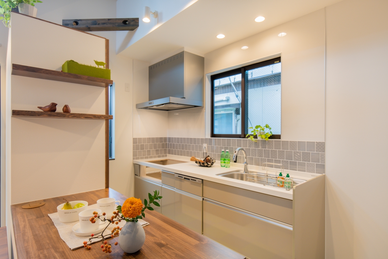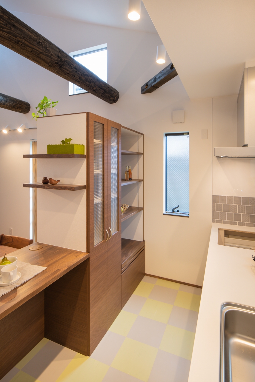 半分を背の高い収納にし、ほどよくキッチンを目隠し。