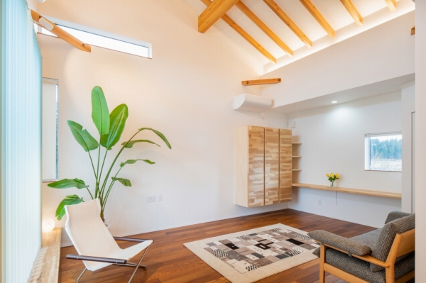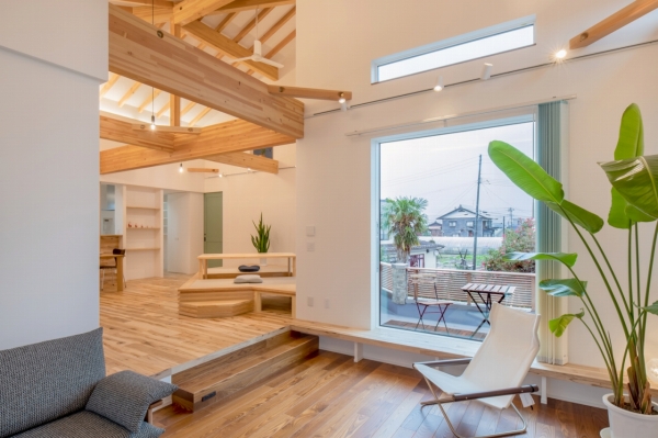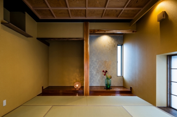 吹き抜けの高さがありながらタタミの落ち着いた空間に。