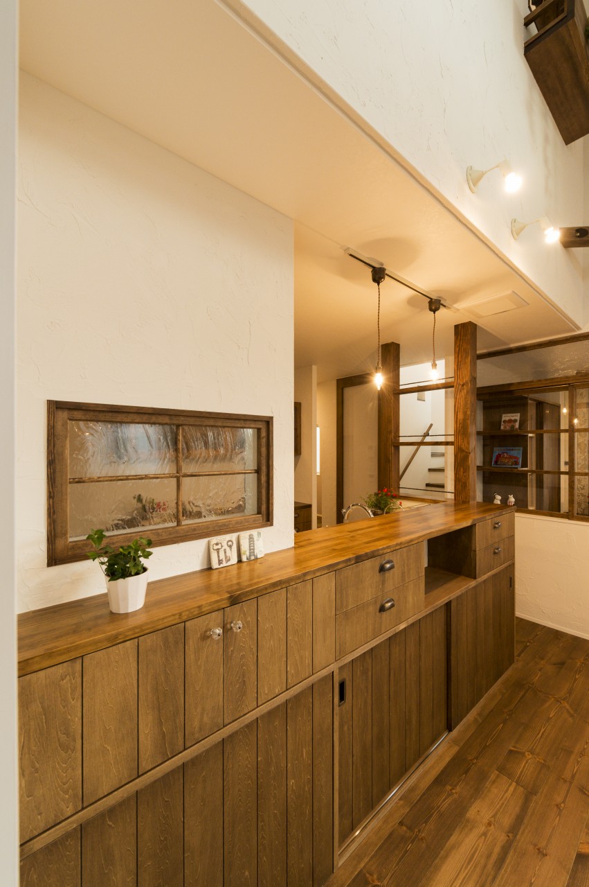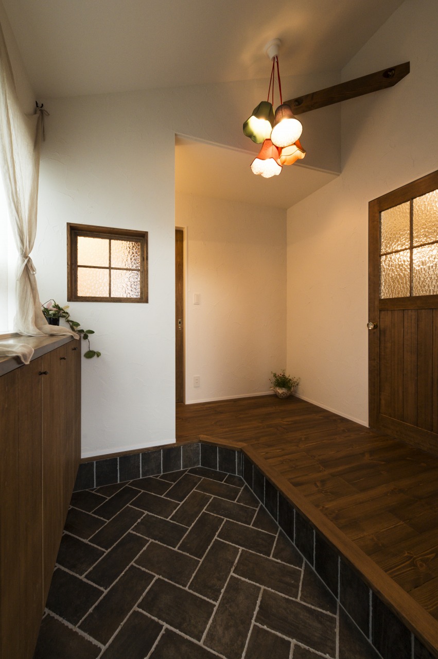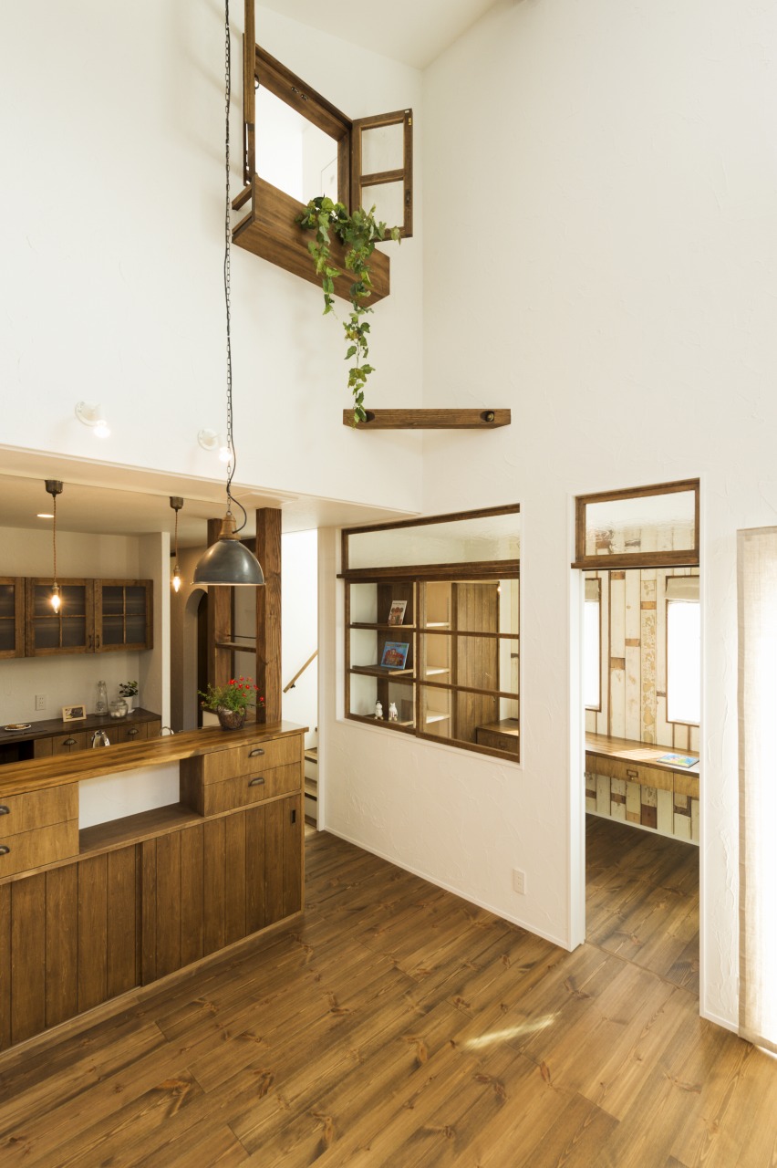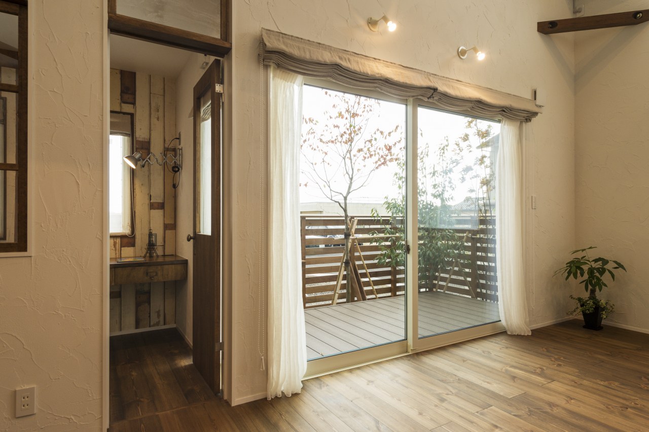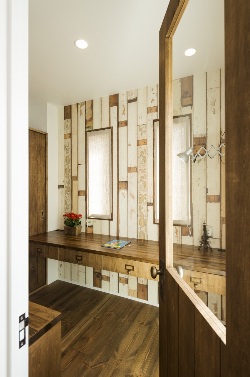 板ガラスの木の扉の丸いドアノブを開けて。
