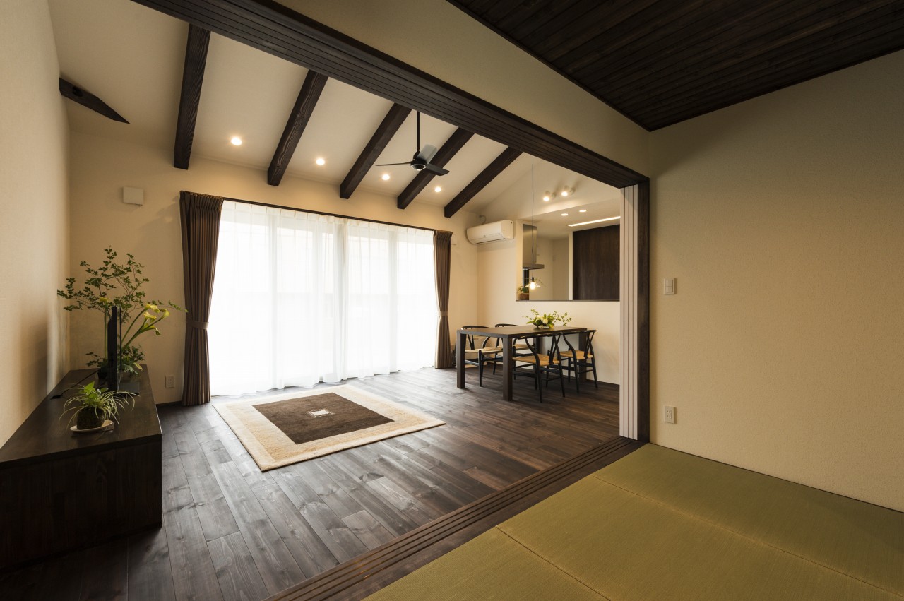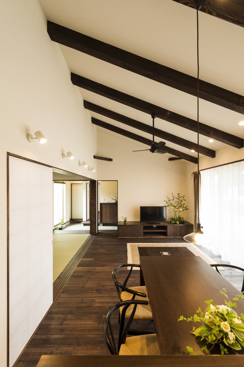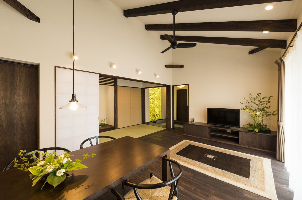 居間の天井は高く、黒い松の梁。