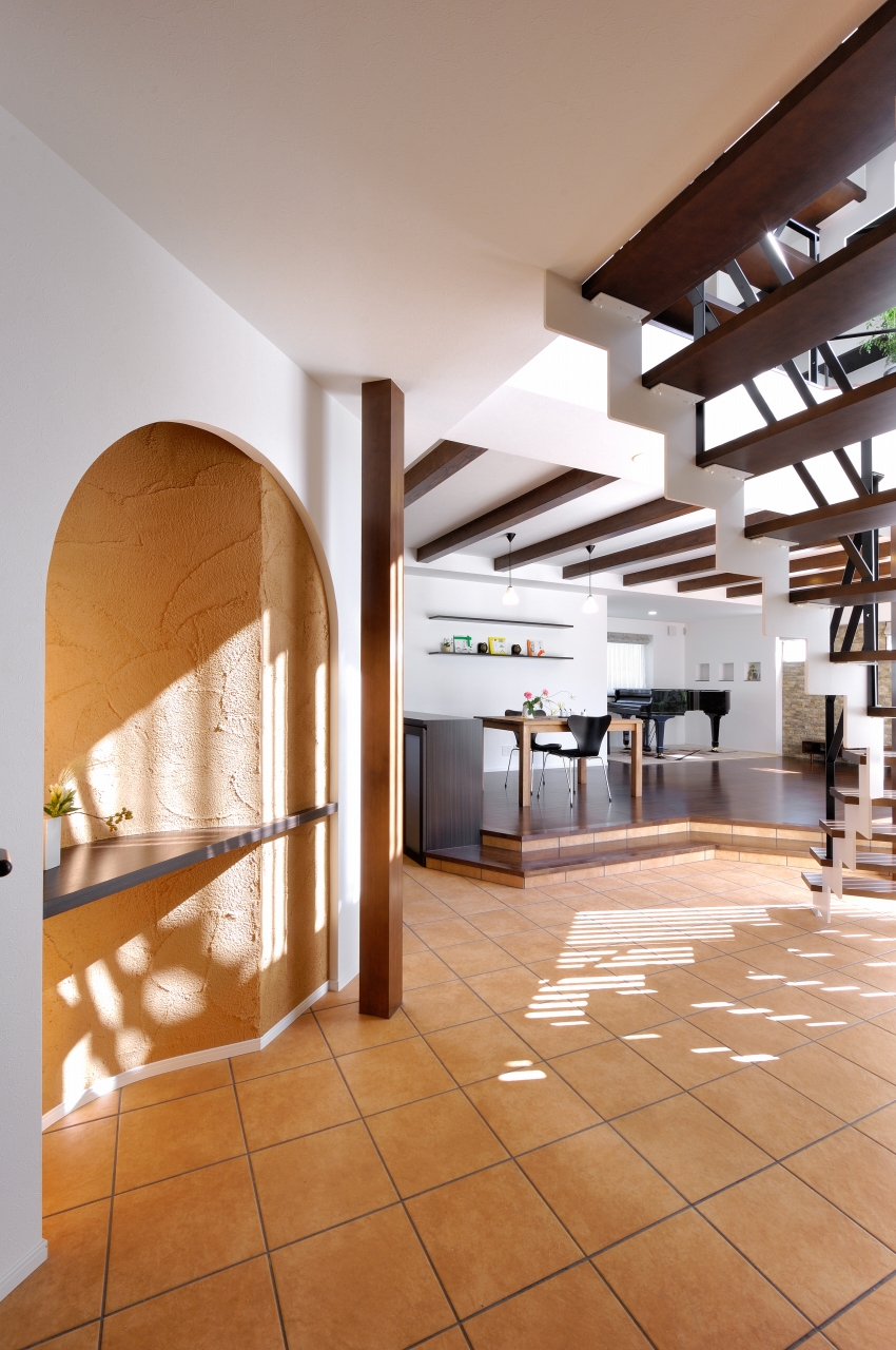 テラコッタタイル床が、家の中からテラスまでつながり、