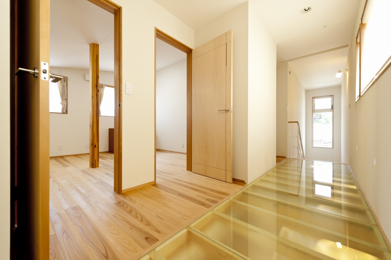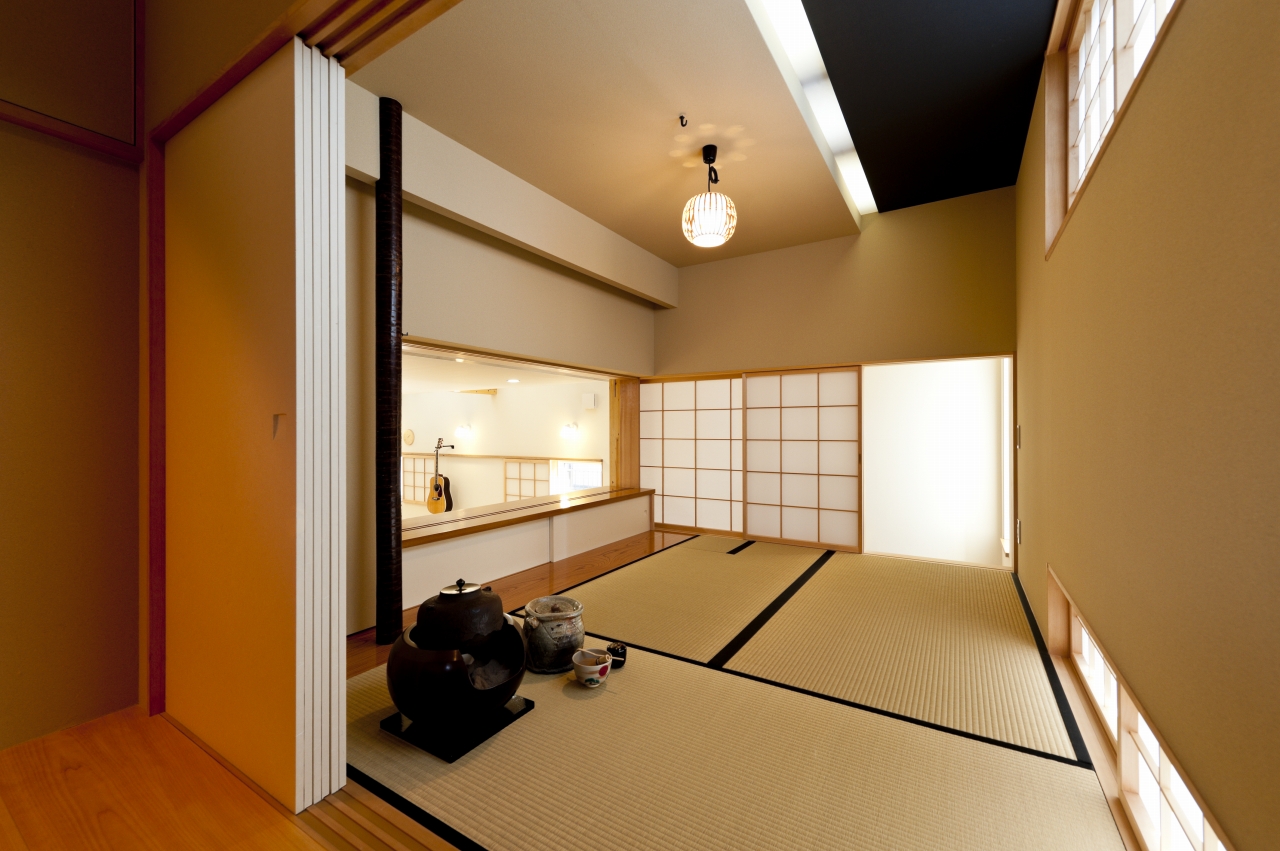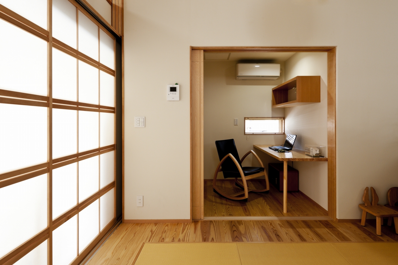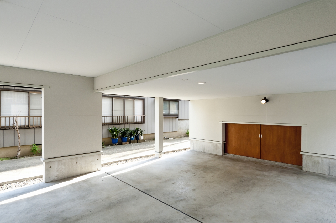 ここでは中庭を中心に、緑を見て二世帯家族が別棟で