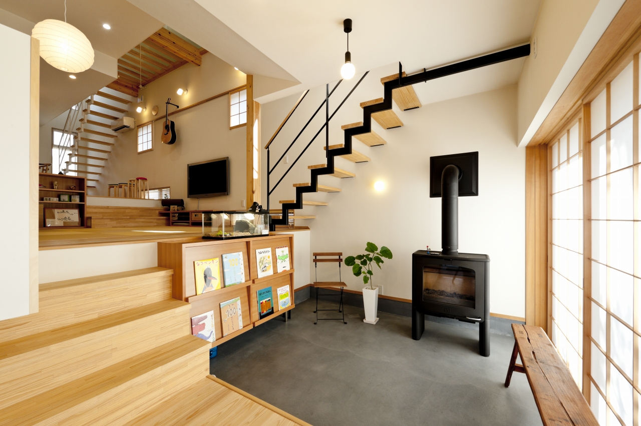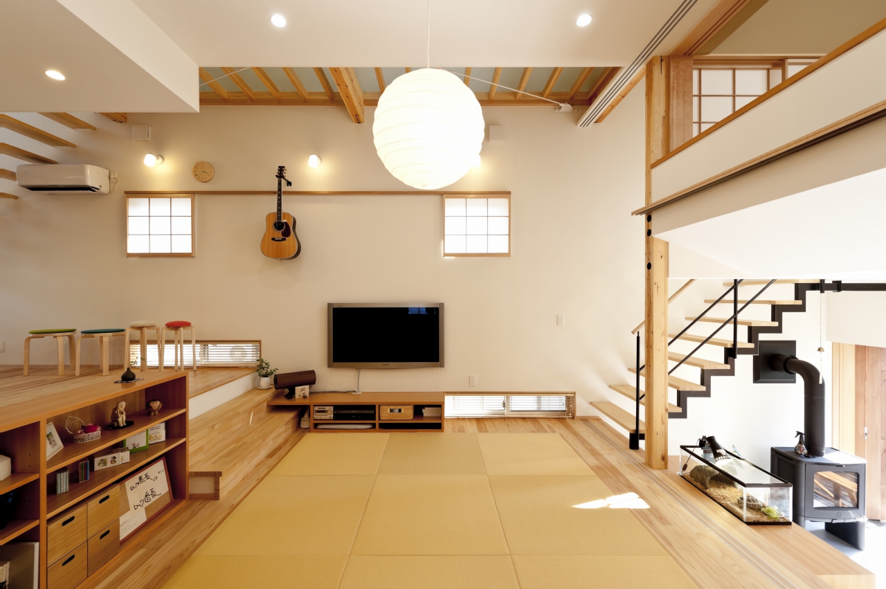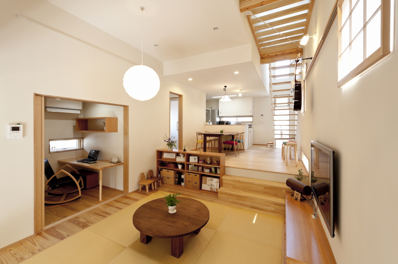 Tubeの中ではダイニング・リビング・土間、そして外の緑へと高さを変えながら、なだらかな丘の様につながっていく。