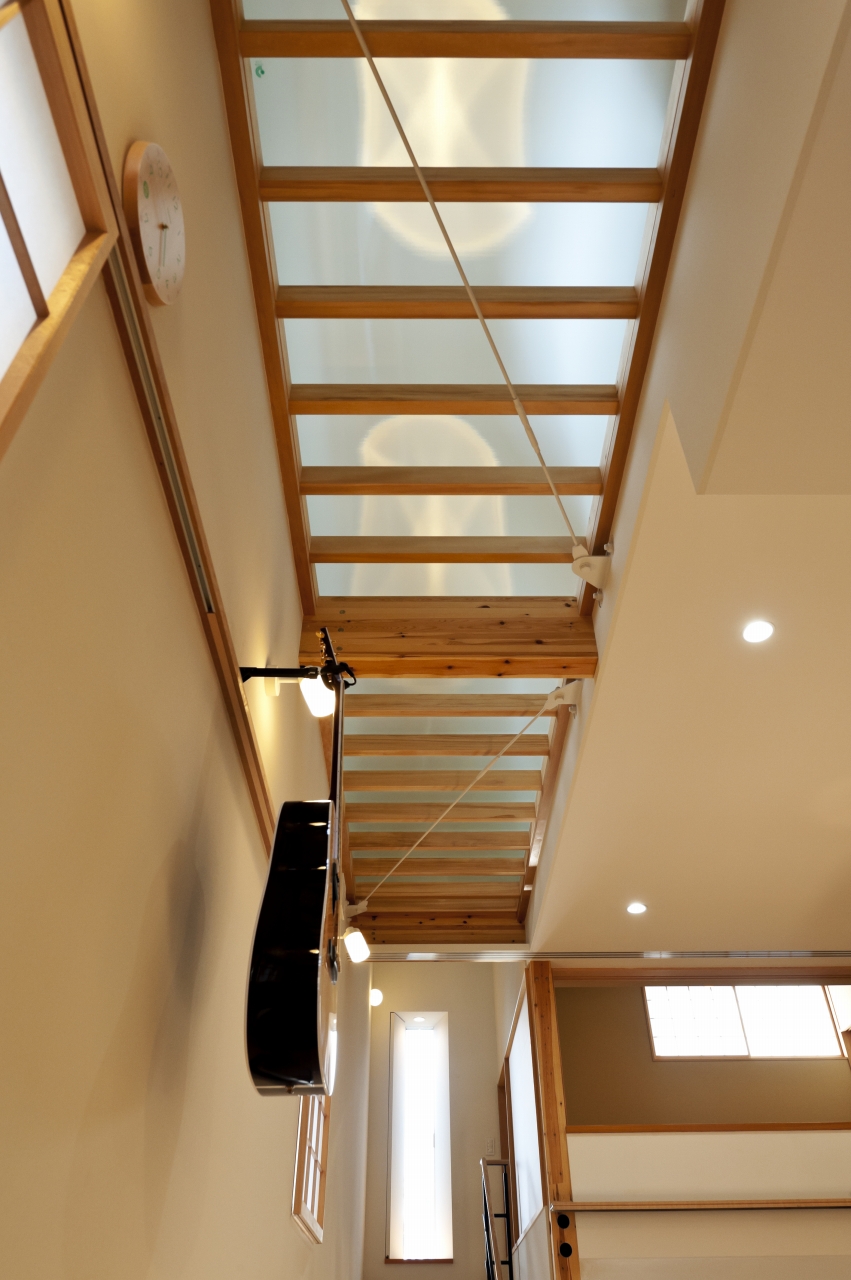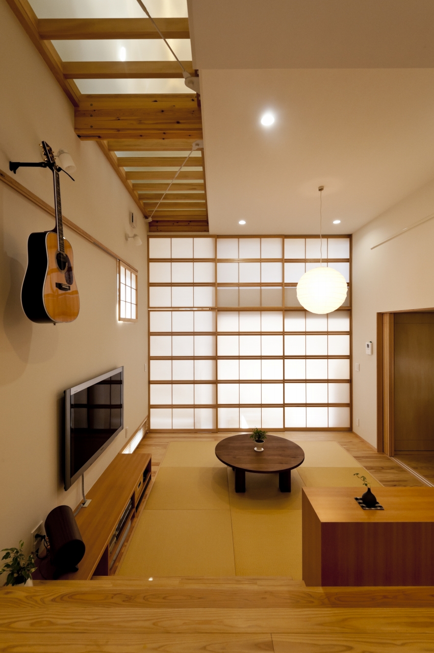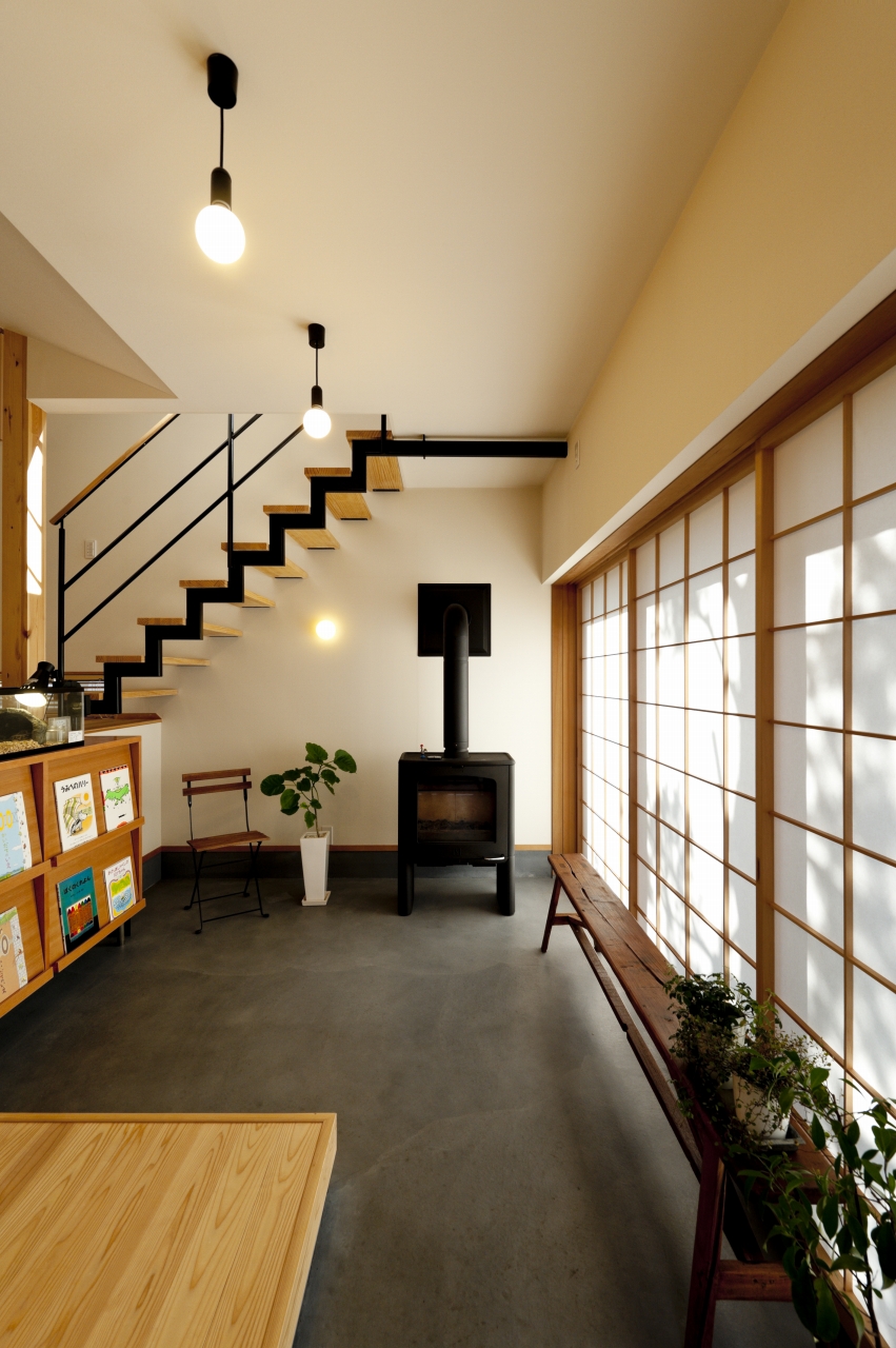 Tubeの中ではダイニング・リビング・土間、そして外の緑へと高さを変えながら、なだらかな丘の様につながっていく。