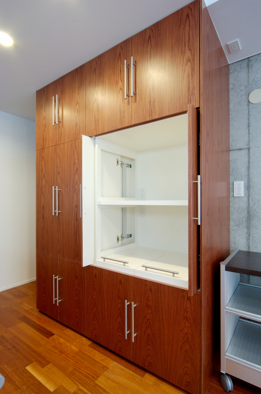 スライドカウンターや収納できる扉で使い勝手よく考えられた造作収納