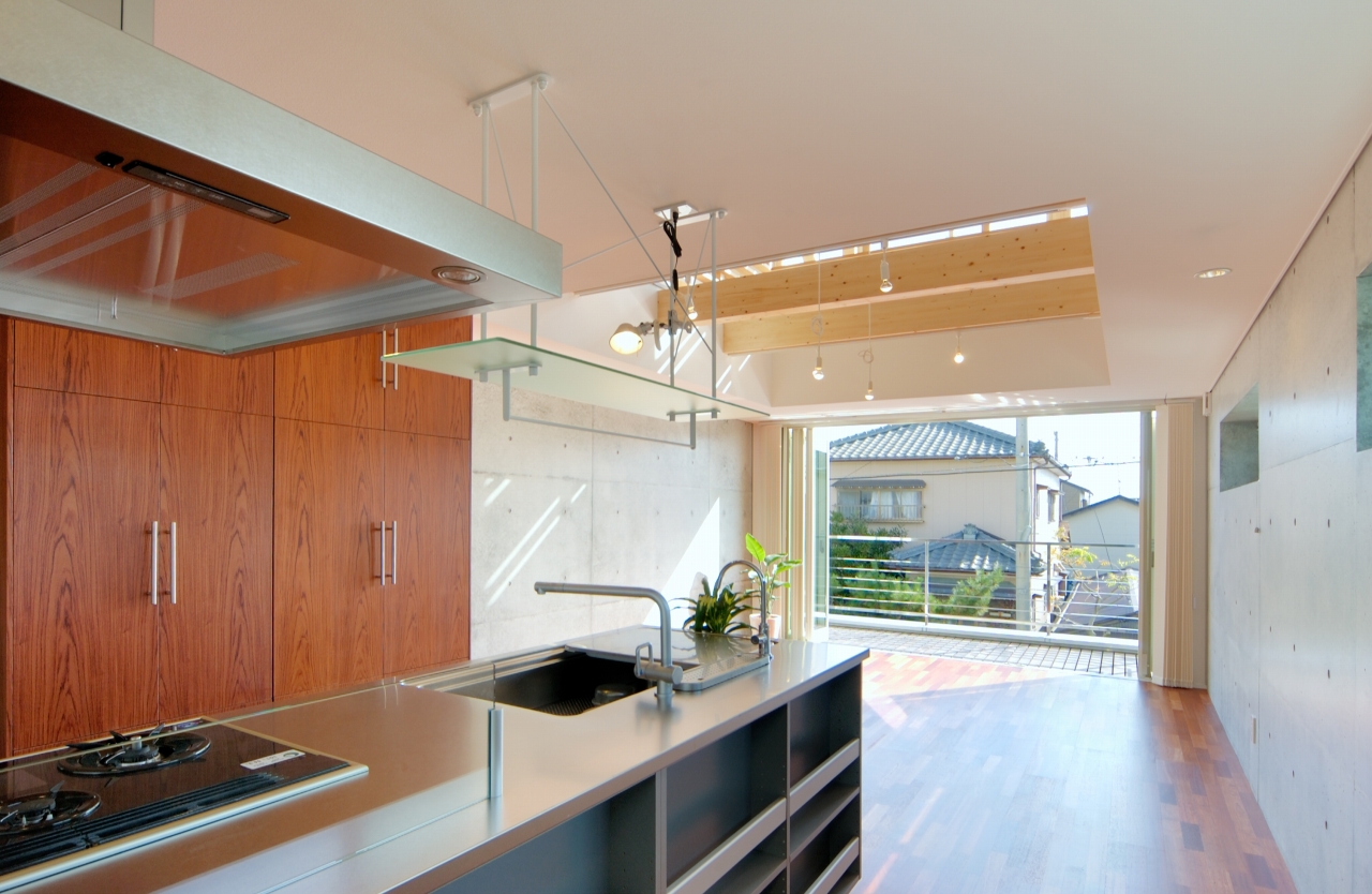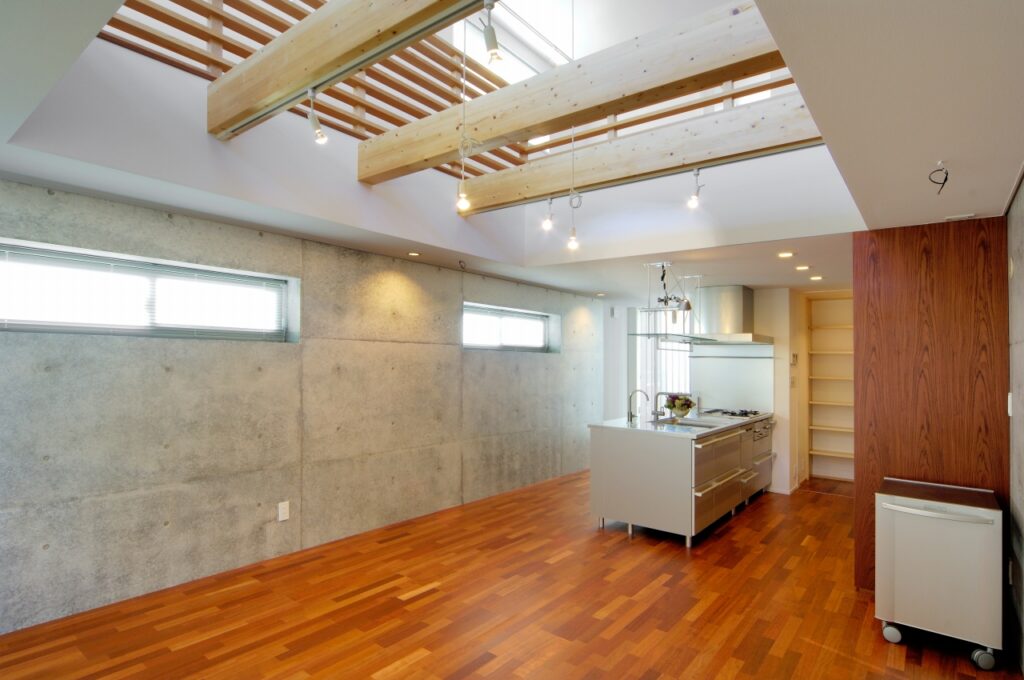 スタイリッシュなオープンキッチンとRC、ケンパス無垢フロアでモダンな空間に